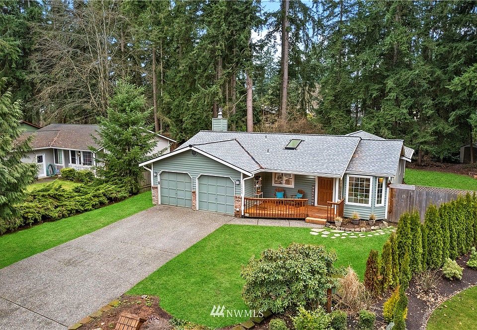 Picture Perfect Rambler in desirable Mill Creek. Nestled at the end of a quiet cul de sac, this place feels like home. The lovely front porch encourages you to hang out, or to step inside to beautiful hickory wood floors & natural light, thanks to vaulted ceilings & skylight. The large living room flows to the kitchen + dining & continues to the family room. Roomy primary bedroom has its own ¾ bath. Step outside from the primary or family room to a large back patio. The rest of the expansive backyard is fully fenced and feels like your own private forest. Boat/RV parking is an option thanks to the 11 foot gate. New roof & interior paint. Park w/ full b-ball court & playground across cul de sac. Close to everything you need. This is the one!