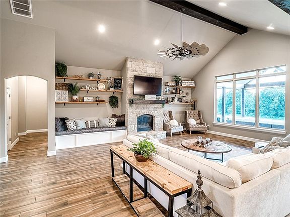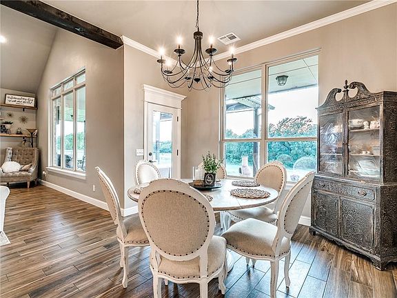 **OVER 1 ACRE IN DEER CREEK** Outstanding, practically-new home in the highly-sought Ridge community, where you can enjoy award-winning schools, rural chic living just minutes from Edmond, and neighborhood amenities like no other; baseball field, basketball courts, tons of greenbelt space, a playground, and a community pool. This flexible floorplan will adapts with your needs. Vaulted, beamed ceilings inside and out, huge windows letting in tons of natural light and providing great views, endless wood-look tile, modern finishes, fantastic covered patios front and back, huge mature trees, and a creek, with plenty of space for fun, all on one of the larger lots in the community. The 4th bedroom is a flex space that can also be an additional living space (as currently used) or an office. Same for the formal dining room. So much flexibility here. BETTER HURRY!