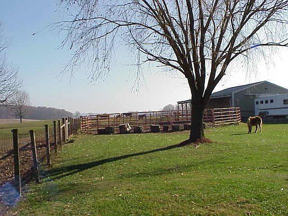 Horse enthusiasts will love this one. Picturesque 7 acre horse farm. 7 stall horse barn with tack room, 1 outside stall. Riding arena, round pen. Large pond stocked with trophy size fish. Charming Cape Cod house with full (clean) basement. Hardwood floors under carpeting. Central air added in 2001. Gas fireplace. Enjoy your morning coffee on the enclosed porch, or back deck. Nicely landscaped yard. Appliances included. (Wagon whe els in yard excluded)
