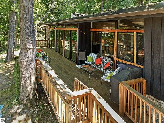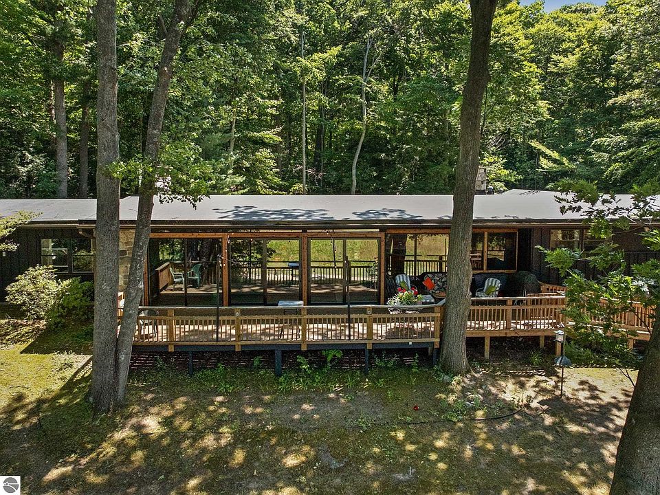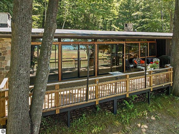 Possibly a once in a lifetime opportunity to own this mid-century mod cottage located in the coveted Rex Terrace Association on Elk Lake. The rich history of this land began in the early 1900s and has been enjoyed by families for multiple generations. This was originally built as a a year-round caretakes home and continues to be one of very few that are used year round. This home sits perched on a hilltop, across from the shared recreational area and overlooking the courts; a space which can NEVER be built on, which means your panoramic view of Elk Lake can never be developed. The home has a modern, open feeling with beamed ceilings and stone fireplace. Brand new roof, Pella Windows and Sliders have been installed, as well as the exterior of the home has new stain and trim. There's a drive-under attached 2-car garage and a 28x48 pole building with 220amp service. The ammennities the Association offers to all of its owners and guests include 1800 ft of shared, private Elk Lake frontage, boat docking, club house, sun deck, tennis and pickleball court, laundry and play house. Plus there are trails throughout for a leisurely stroll. This home has never been on the open market and it is RARE that any homes ever are. Rex Terrace is a timeless Northern Michigan gem, that you have an opportunity to continue to cherish and enjoy for years and generations to come.