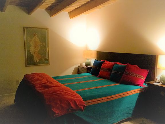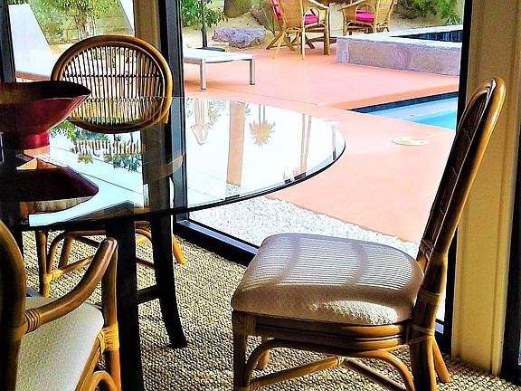 Located in tranquil and highly desirable Deepwell Estates, this Mid-Century beauty boasts stunning panoramic Mountain Views with spacious living areas. The great room features sandblasted tongue and groove wood ceilings, amazing stone fireplace, 24''x 24'' slate flooring throughout, and walls of glass overlooking the professionally landscaped yard and pool. The kitchen boasts beautiful quartz countertops, stainless steel appliances, built-in gas range, and seamless outdoor access to the yard. This home features two Master en-suites providing ultimate privacy for you and your guests, as well as a spacious full size casita with its own entry, living area and kitchen. This South Facing home boasts a large saltwater swimming pool, with an oversized spa, a gazebo, and two covered outdoor living rooms, perfect for entertaining. Enjoy dramatic Mountain Vistas, Sun, ultimate privacy, and complete tranquility. Paid Solar panels, FEE Simple Land, partially furnished.