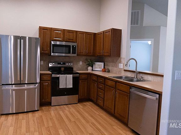 Move-in ready 3 bedroom, 2 bath home in a quiet neighborhood, conveniently located near schools, shopping, restaurants, and parks. Interior of home features all new carpet, updated lighting fixtures, and updated door hardware. Lovely split bedroom plan with vaulted ceilings in the main living area creates a very spacious feel. Eat-in kitchen has a breakfast bar and new stainless steel appliances, including a refrigerator with an ice-maker and interior water dispenser! En suite master bedroom is generously sized and has a walk-in closet off of the bathroom. Bathrooms have new water efficient toilets. Large laundry room includes a wall of pantry shelving. The two car garage has new door and opener. The large, shaded back yard has two beautiful, and well-established trees!
