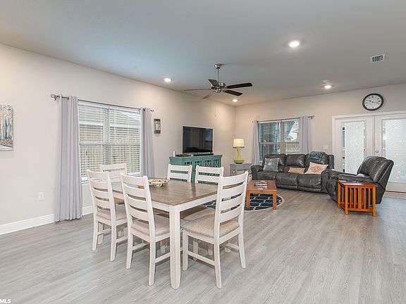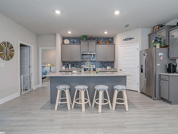 Totally Open Concept Floor Plan New Home in Ethos, one of Foley’s only Gated Communities located just minutes from the sugar white sand beaches of Gulf Shores and Orange Beach, and centrally located to shopping, dining, entertainment, and medical facilities. This small community supports an active adult lifestyle with a tennis court, outdoor pool, and sidewalks for morning walks. This 3BR/2BA home has an open floor plan with 9' ceilings and amazing natural light illuminating the great open space. The kitchen and bathrooms feature gorgeous granite countertops and painted cushion close cabinets. The custom tiled backsplash all the way to the ceiling is not only functional, but also beautiful. The center island with stools provides space for entertaining family & guests. The master suite is grand enough for a large king bed & has two closets, one of them as large as a small bedroom! The luxurious en suite bathroom has a spacious stand-alone walk-in shower and dual vanities with plenty of counter space and storage, plus there is a linen closet for storage of all the beach towels you’ll need for visitors! Two guest rooms at the front of the home and a full bathroom offer privacy. Enjoy relaxing in the shade on your screened-in back porch, complete with comforting ceiling fan and cable TV hookups. Enjoy ease of ownership with a low maintenance home that’s ideal for aging in place, with wide accessible hallways and doorways and small yards with little maintenance. Upgrades include screened porch, fully fenced yard, and gutters.This 2021 home is built to GOLD FORTIFIED certification and includes hurricane fabric shield protection for windows and doors, and Smart Home Technology, which includes control panel, doorbell, Smart code lock on front door, 2 smart light switches, smart thermostat, remote open/close your garage door, seamlessly controlled on one app, all of which may save the buyer on homeowner’s insurance. HOA fees include Lawn Care, Pool, Amenities, & Commons