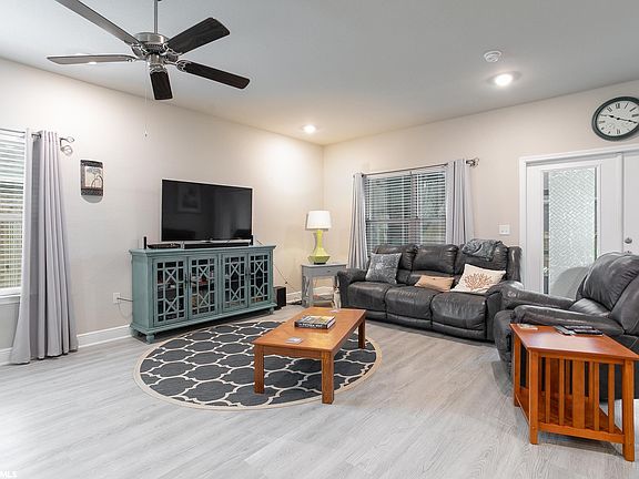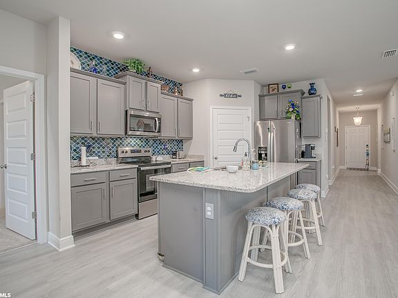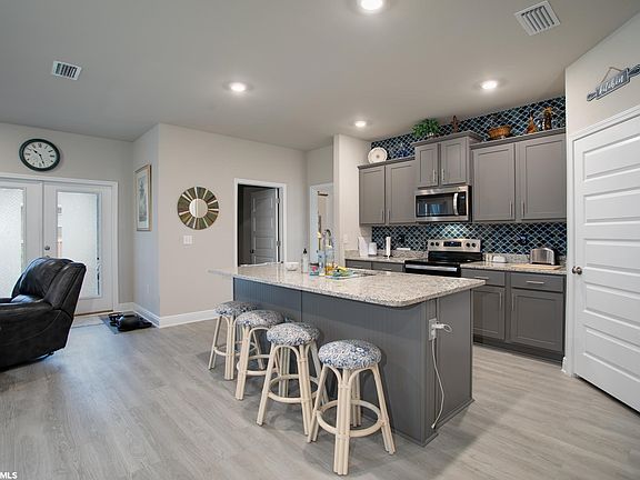 Totally Open Concept Floor Plan New Home in Ethos, one of Foley's only Gated Communities located just minutes from the sugar white sand beaches of Gulf Shores and Orange Beach, and centrally located to shopping, dining, entertainment, and medical facilities. This small community supports an active adult lifestyle with a tennis court, outdoor pool, and sidewalks for morning walks. This 3BR/2BA home has an open floor plan with 9' ceilings and amazing natural light illuminating the great open space. The kitchen and bathrooms feature gorgeous granite countertops and painted cushion close cabinets. The custom tiled backsplash all the way to the ceiling is not only functional, but also beautiful. The center island with stools provides space for entertaining family & guests. The master suite is grand enough for a large king bed & has two closets, one of them as large as a small bedroom! The luxurious en suite bathroom has a spacious stand-alone walk-in shower and dual vanities with plenty of counter space and storage, plus there is a linen closet for storage of all the beach towels you'll need for visitors! Two guest rooms at the front of the home and a full bathroom offer privacy. Enjoy relaxing in the shade on your screened-in back porch, complete with comforting ceiling fan and cable TV hookups. Enjoy ease of ownership with a low maintenance home that's ideal for aging in place, with wide accessible hallways and doorways and small yards with little maintenance. Upgrades include screened porch, fully fenced yard, and gutters.This 2021 home is built to GOLD FORTIFIED certification and includes hurricane fabric shield protection for windows and doors, and Smart Home Technology, which includes control panel, doorbell, Smart code lock on front door, 2 smart light switches, smart thermostat, remote open/close your garage door, seamlessly controlled on one app, all of which may save the buyer on homeowner's insurance. HOA fees include Lawn Care, Pool, Amenities, & Commons