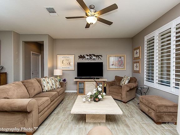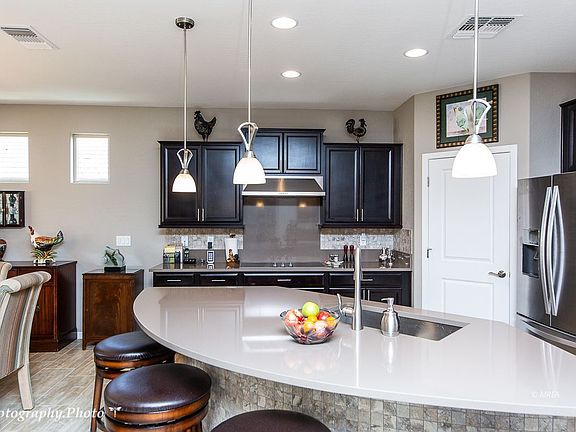 Why wait for a new build when you can move into this fabulous Sun City Hideaway model! Wow----over 100k in builder and after market upgrades are included in this lovingly cared for home. The work has been done for you! Plantation shutters, ceiling fans, & landscaping are installed. This beautiful home has a sought after 4' garage extension. Professional landscaping with pavers enhance the curb appeal. The front door has a costly crystal glass insert. Upgraded tray ceilings in the foyer & master. The kitchen is a gourmet's dream with upgraded espresso stained Tahoe Maple cabinets, highly upgraded Toluca Sand quartz countertops, single basin sink, and stainless appliances, including a French Door fridge with Accu-chill. The custom tile backsplash & the tile design on the island face are stunning! The master bedroom has a costly bay window adding room for a seating area. The master bath has a zero entry & frameless door, upgraded fixtures, & piedrafina counters. The extended laundry has 6 month old washer & dryer. sink, & loads of storage The flex space has an exquisite custom built in area that works as an office or craft area! The back yard is splendid with upgraded landscaping.