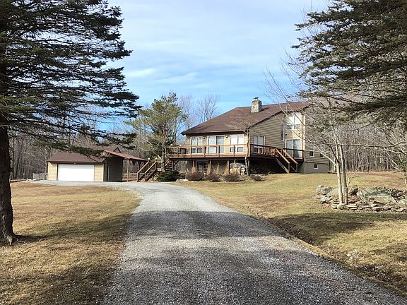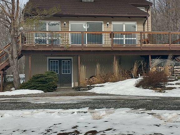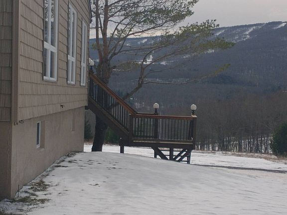 The magnificent panoramic mountain and Belleayre Mountain ski slope views will sell you on this spacious 3 bedroom, 2 bath contemporary home on 5.01 acres being just minutes to the slopes, the Pine Hill Lake and Hannah Golf Course, features a 19'x26' great room, pine cathedral ceiling, ceiling fan, floor-to-ceiling stone fireplace w/Napoleon airtight wood insert, track lighting, wood floors, lots of glass looking out at views, sliding glass door to 10'x36'x8'x20' deck, 8.5'x10' kitchen area w/vinyl flooring, all stainless steel appliances: LG gas stove, LG microwave, LG refrig/freezer w/ice maker, Maytag dishwasher, wood cabinets, formica countertop, track lighting, 14'x15' screened-in porch w/ceiling fan, cathedral ceilinged, ceramic tiled full bath, linen closet, hallway w/closet, carpeted 12'x15.' bedroom w/closet, sliding glass door to deck, UP: 13'x15' sitting area, pine ceiling, wood floors, ceiling fan, full ceramic tiled bath w/steam shower, carpeted 12'x15' bedroom, closet, ceiling fan, DOWN: slate floor 7.2x12' mudroom, carpeted 12'x21.7' family room, pantry closet, pine walls, large closet, carpeted 11.6' x x 16' bedroom w/closet, utility room w/Whirlpool gas dryer & Amanda washer, Kenmore refrig/freezer, , 200 AMP el. service, newer 2-zone Burnham V8H furnace for HW baseboard heat, Amtrol Boiler Mate hot water heater, 275 gal. oil tank, asphalt shingled roof, poured concrete foundation, exterior is vinyl siding, NYC DEP septic system, well. 24'x24' 2-car garage & carport w/ample storage area, electric, automatic door opener.