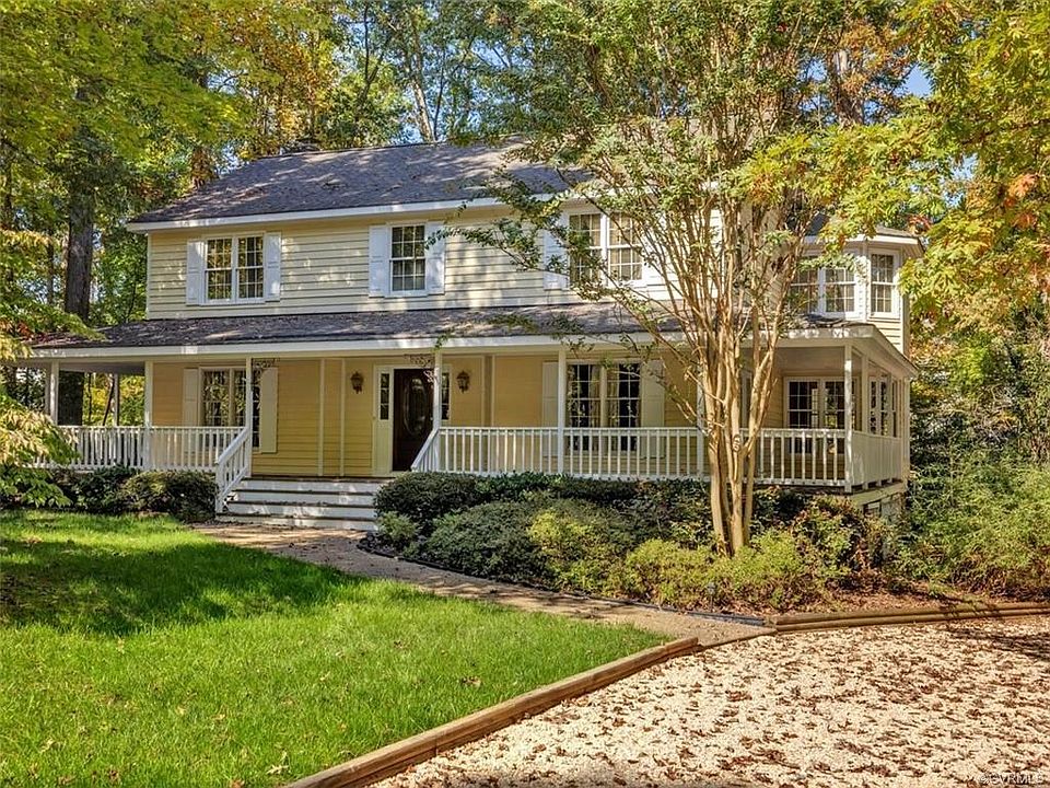 GORGEOUS COLONIAL-STYLE HOME WITH WRAPAROUND PORCH! This incredible property is located in Chesterfield County and features 4 BR, 2.5 BA, 2,747 sq ft, HDWD throughout, two sunrooms & gourmet kitchen! A welcoming front porch invites you into a stunning foyer opening to formal living & dining rooms each adorned w/crown molding & access to wraparound porch through beautiful French doors. Flow effortlessly to your dream kitchen featuring granite counters, large center island w/countertop range, wall oven, SS appliances & darling morning room w/tons of natural light. Expansive family room showcases cozy wood-burning fireplace w/brick surround. Bring & sunny Florida room boasts vaulted ceiling, skylights & access to rear deck. Additional bonus sunroom opens into kitchen for perfect convenience! Head upstairs to reveal primary suite, the ultimate retreat for mom & dad featuring gleaming hardwood floors, crown molding and his/hers closets. Primary en suite boasts tile floors, dual vanity & tub/shower combo. Additional three generous sized bedrooms each offer hardwood flooring, crown molding and oversized closets. Ample storage space can be found in pull-down attic as well as detached shed!