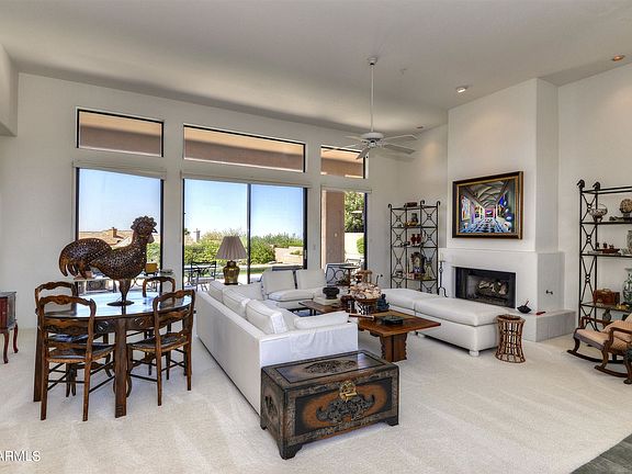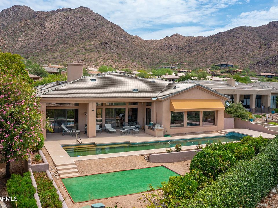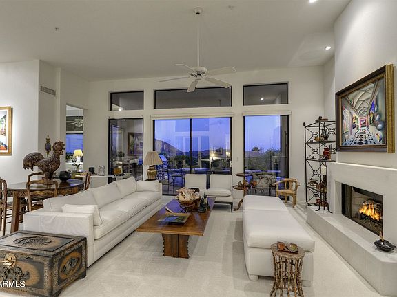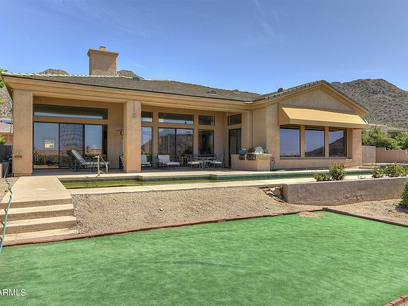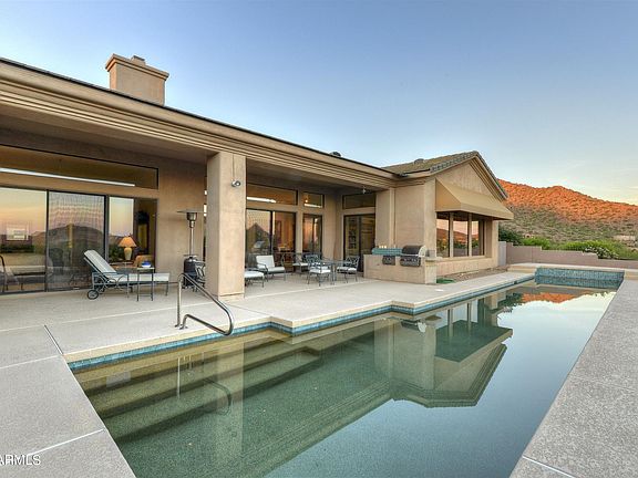 WOW! Lovely terraced hillside home with gorgeous views in every direction: sunrises/sunsets, city lights and Camelback Mtn. views. Inviting living space overlooks the backyard with a 60' lap pool, BBQ, Herb Garden + 8 Fruit Trees and deep covered patio to enjoy seamless indoor/outdoor lifestyle year round. Soaring ceilings, gas kitchen, new cement tile roof in 2016 and NO STEPS inside or outside of this home. Split floorplan with office and large kitchen/great room offers ultimate lifestyle flexibility and use of living space. Guard Gated Community with Community Spa, Tennis/Pickleball Courts. Easy access to McDowell Mountain hiking trails, 3 Golf Courses, Mayo Clinic, and top rated schools with shopping and dining nearby.