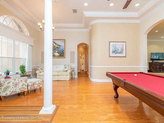 Desirable Villages of Avalon in Spring Hill. 4 Bedroom, 3 Bath, 3 Car Garage home- encompassing 2589 SF Living and 3624 SF Total. Soaring 12 ft ceilings and beautiful wood floors in the dining and living rooms along with a spectacular pool view through the sliders to the lanai. Double crown molding and picture frame molding accent the dining room and many other rooms throughout the home along with 6-inch baseboards and custom wood valances on all the windows and sliding doors. The kitchen features granite counters, abundant cabinet space, walk-in pantry, center work island, newer stainless-steel appliances, and spacious breakfast nook. Open to the kitchen is the family room, complete with full-wall sliders open to the pool and lanai. Family room is wired for home theater surround sound. The primary suite, also with access to the pool and lanai, offers two large closets and master bath with dual sinks, granite counters, soaking tub, and walk-through shower with seating. The second bedroom has the potential to be a private suite for a guest or family member with a pocket door separating the room and its adjacent bath from the rest of the living area as well as offering private pool access. The other 2 bedrooms are spacious and share a full bath. ALL bedrooms have walk-in closets for ample storage! The home's flooring choices includes luxury vinyl plank flooring, ceramic tile, and wood. This home offers 2022 HVAC and dug well for irrigation. The laundry room is conveniently located just off the kitchen and has a utility sink and storage. Continuing to the backyard oasis that extends the home's entertaining area, you'll be greeted by a large screened lanai and pool deck with pavers. Kidney shaped salt water pool with water fountain feature is sure to be a year round attraction. The backyard offers high-quality vinyl fencing ensuring a private retreat. The oversized 3 car garage provides plenty of parking and storage. The home has a security system (requires a subscription) and there are security cameras and motion sensor flood lights around the exterior of the home. Just up the street from this beautiful home is the Villages of Avalon Community Clubhouse and Pool offering even more exciting options for residents with a well-equipped gym and large pool. Quick access to Suncoast Parkway and Veterans Parkway making an easy trip to Tampa and all points South. Make your appointment today to see this beautiful home!