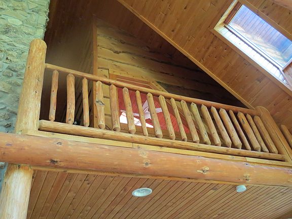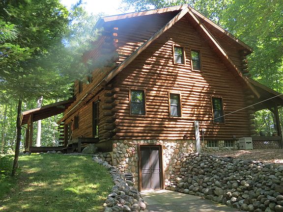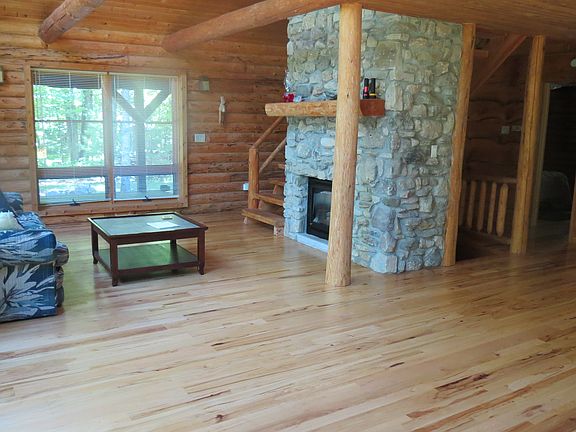 Full log home on 31.74 acres of private, wooded land. Log exterior and interior, complemented by Canadian cedar siding inside. Floor to ceiling stone fireplace, vaulted ceilings, skylights, energy efficient Hurd windows complete an entire wall to view the woods and wildlife. Hickory hardwood floors through out the entire main level, and upstairs. Custom hickory cabinets in kitchen and mudroom to match. Finished lower level walkout with woodstove. Huge covered front porch, stone path leading to finished fire pit area. Paved driveway, 2 1/2 stall detached garage with finished interior, insulated, full set of stairs leads to loft. Additional extra tall garage, also insulated with a loft with the ability to house a pontoon boat. Trails throughout wooded property, with natural rock outcroppings...no neighbors in sight!!!!