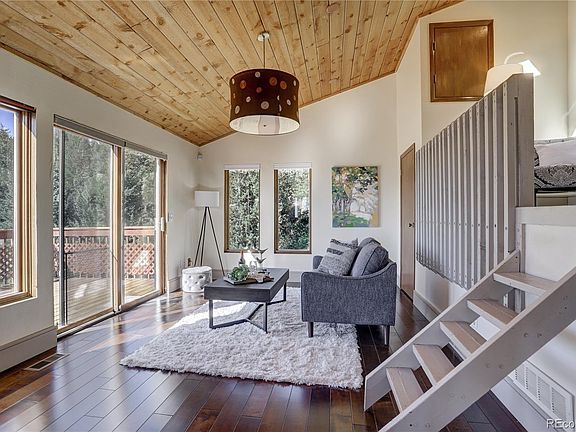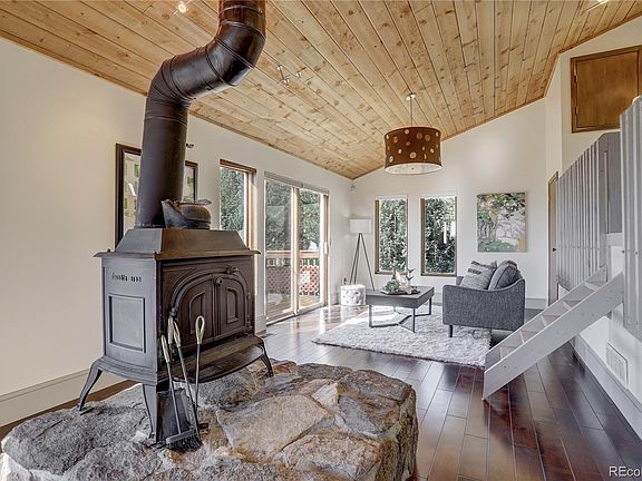 Welcome to your Rocky Mountain Sanctuary ideally located only 30 minutes from Denver in highly desirable Evergreen, Colorado. This sun-kissed mountain contemporary home blends naturally with the outdoor environment through the abundant floor to ceiling windows that comprise the whole eastern side of the home, offering amazing tree top views & glorious morning sunrises. Upon entrance, you are greeted with dark wood flooring, custom tongue & groove vaulted ceilings, a lovely eat-in kitchen with newer SS appliances, skylights, lots of cabinet space and an ample living room warmed by a wood burning stove and transitional drum & track lighting fixtures. A charming Powder Room is conveniently located near entry & kitchen. Don't miss the elevated bonus space above the living room perfect for an office, reading nook or playroom. Enjoy your morning coffee on the exterior deck while watching local wildlife pass by. A retractable patio awning offers shade & protection from the elements. At night, retreat to the master suite located one level down with an updated 3/4 master bath & private exterior patio. An updated full bath is located on the same floor. The basement boasts two additional bedrooms, one with a Murphy bed & built-ins, great for guests or home office, plus a newly finished laundry space with cabinets, drying racks and retractable clothes line. The one acre sloped lot offers privacy, distant layered mountain & city light views. Three outdoor storage sheds provide plenty of space for lawn tools and Colorado toys. Hyland Dr is County Maintained. Enjoy close proximity to 1-70, local shopping & amenities, lower Clear Creek County taxes and a short drive to world class skiing.