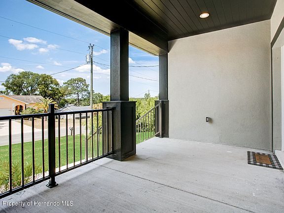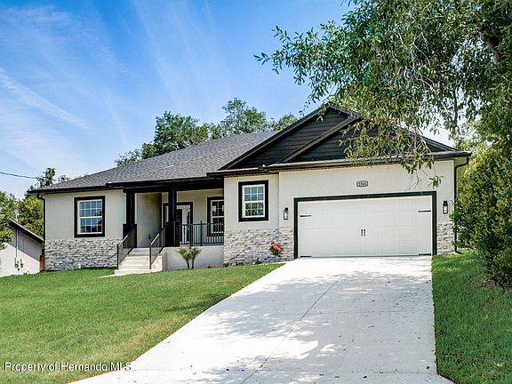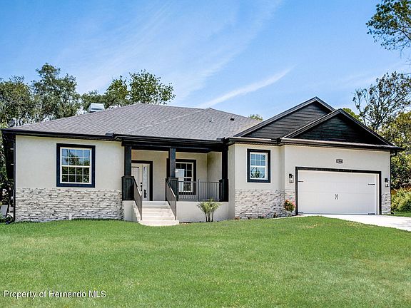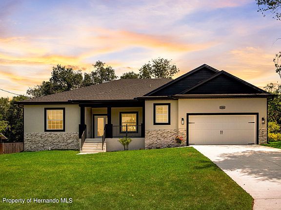 Welcome to your dream home in the heart of Spring Hill, FL. This stunning new construction property offers the perfect blend of modern luxury and thoughtful design. As you step inside, you're greeted by an open floor plan that seamlessly connects the living spaces, creating a spacious and inviting atmosphere. The kitchen, with complete appliance package, overlooks the family room with views of the lush back yard. The dining room has elegant arches defining the area. The home features 3 bedrooms, 2 bathrooms, and a versatile flex room that can be used as a home office, playroom, or TV room to suit your lifestyle. The kitchen is a chef's delight with shaker cabinets and expansive quartz counters. The bathrooms also boast the same high-quality finishes, including dual sinks, a soaking tub and large walk-in shower in the primary bath. The second bath has the same finishes, just on a smaller scale. The primary bedroom offers a relaxing retreat, with ample room and luxurious en suite bath. Sliders lead out to the covered lanai and view of the back yard. The split floor plan's secondary bedrooms are generously sized and feature ceiling fans and closets with double doors. Each bedroom and the flex room are prewired for wall mounted TVs. Every detail has been carefully considered, from the luxury vinyl plank floors to the crown molding, 6-inch baseboards and wood framing around the windows. Wood plank ceilings adorn the front and back porches, creating cozy outdoor retreats where you can relax and enjoy the beautiful Florida weather. Practicality meets style with an inside laundry room complete with a sink for added convenience and plenty of room if you would like to add shelving or cabinets. The property is also adorned with new sod and landscaping, adding to its curb appeal and creating a serene outdoor oasis. The garage is extra large, with storage space galore! The landing at the bottom of the stairs provides room for storage, an extra refrigerator or chest freezer. The high ceiling would make a great area for overhead storage racks and the attic is floored for additional storage. Located in Spring Hill, this home offers convenience, comfort, and modern living at its finest. A short drive to restaurants, shopping, medical facilities, outdoor recreation and the beach, don't miss the opportunity to make this exceptional property your own!