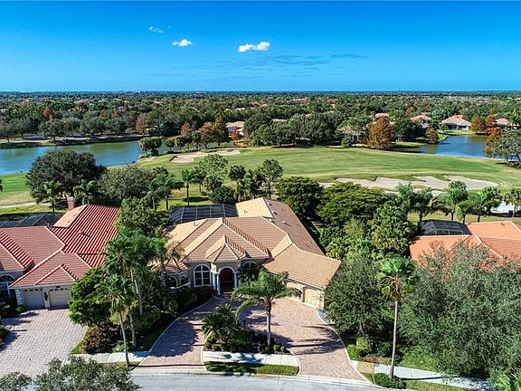 Beautiful and grand this custom built 3 bedroom, 3 bath Pruett home displays its own elegant statement from the time you drive into the circular driveway with its oversized 3 car garage & built in air conditioned storage room. Entering the stately home thru the solid tall wood double front doors gives you a sense of quality of workmanship. The remarkable flow, functionality and beauty has been thoughtfully detailed throughout. Soaring 12 foot ceilings, crown molding, tray ceilings, 2 gas working fireplaces , vast windows, pocket doors, built-ins and custom closets are a few finishing touches. The massive private outdoor lanai space has covered and screened sitting areas overlooking the 7 hole with a lake view on the beautiful lush Arnold Palmer Signature Design 18 hole championship golf course. Beautiful sunsets! Property lot size is almost 1/2 acre. Enjoy entertaining using your outdoor kitchen or large living room, dining room, family room or game room. Kitchen is tastefully decorated with granite and quality wood cabinetry. Separate home office finished in cherry wood. Golf membership is optional. Available amenities include Golf, Tennis, Pickleball, Fitness, Aquatics, Dining and Social Activities. Don't wait to enjoy this meticulously maintained custom home or live the lifestyle in this gated community of Lakewood Ranch Golf & Country Club.