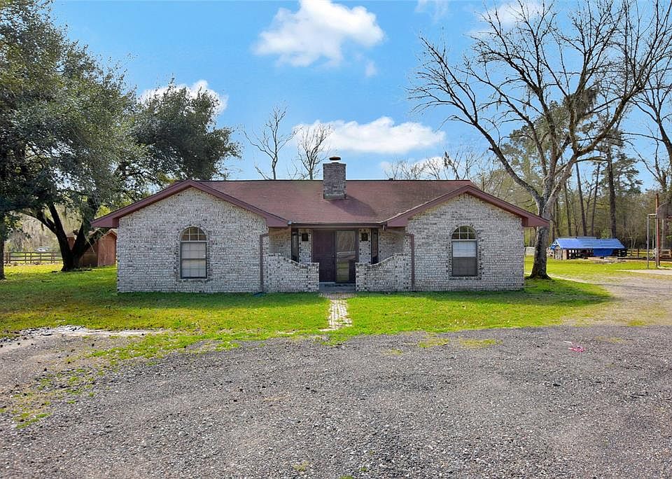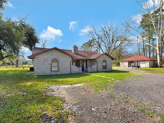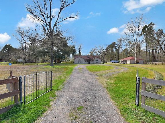 Well maintained ranch-style 3BDR/2.5BTH home on 4.83 acres (2 lots). Unrestricted and fully fenced. Property includes the brick house with covered wooded deck, metal barn with stables, pasture with pond and geese, storage shed and 2 car detached garage. Large living area with wood-burning fireplace. Kitchen is combined with breakfast area. Formal dining room. Ceramic wood tile throughout the house. Stainless steel appliances, side by side fridge is included. New water heater installed in 2018. AC system was replaced 3 years ago. Great property for cattle and horses, in close proximity to the Woodlands amenities and main hospitals.