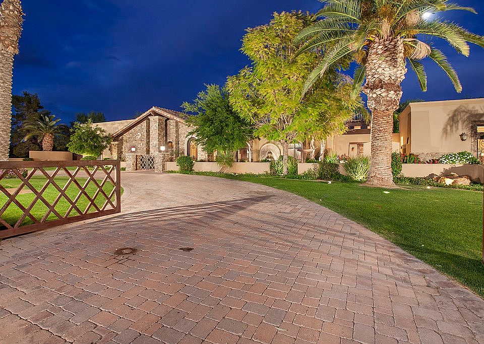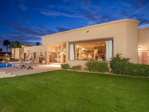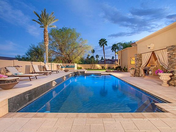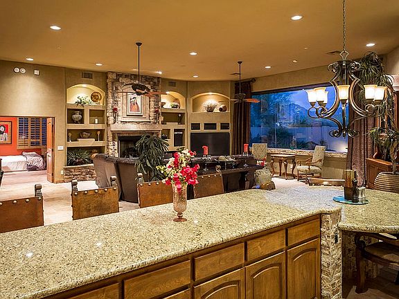 Pvt. estate where sophisticated ambiance meets modern finishes. Stone & brilliant hardwood flooring, Venetian plaster, granite counters & cantera fireplaces. The kitchen, family & game room with 2 custom islands create the perfect entertainment area. The exterior exudes charm w/natural stacked stone,pavers,lush landscaping, tranquil courtyard w/fireplace & cantera fountain. Mountain views plus fantastic detached guest home w/ its own family room, full kitchen, laundry room, bedrm & garage makes the perfect home! Located mins from fine dining & shopping, quick access to the 101. Great park across the road that features tennis, basketball,volleyball & playground areas, ramada w/picnic tables , walking & bike paths.