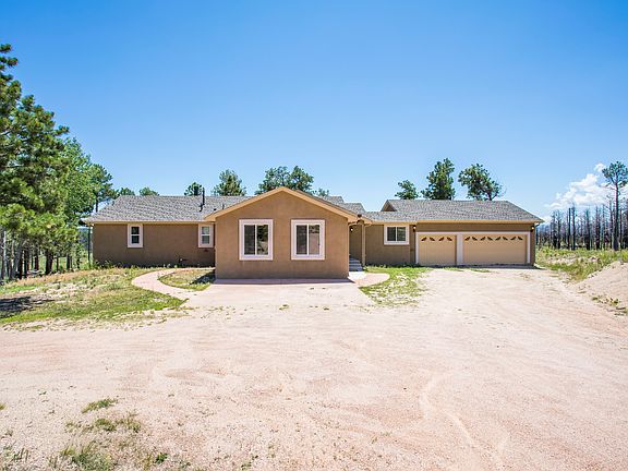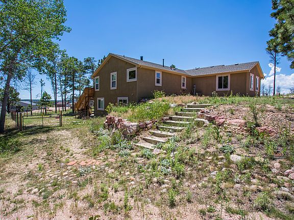 This stunning home is located on 10.5 acres close to Colorado Springs* There are exceptional views of Pikes Peak from the property* The Office has beautiful wood floors that flow down the hall to the open living area with the Living Room, Dining Room, and Kitchen all open* The Gourmet Kitchen has a large center island with counter bar seating, stainless steel appliances, spacious pantry, granite countertops, and 42" cabinets* The Dining Room and Living Room both have a walk-out to the back deck* The Living Room features a wood fireplace with stone wall and built-in entertainment niches* Also on the main level is this home is the generous Master Bedroom (with a walk-out to the deck, huge walk-in closet and adjoining Master Bath), additional Bedroom and half Bath* The Basement has a spacious Family Room (with wet bar, walkout to the covered patio, and gas fireplace), 3 additional Bedrooms and 2 Baths* There is a huge 60x15 deck and covered patio* Also on the property is a