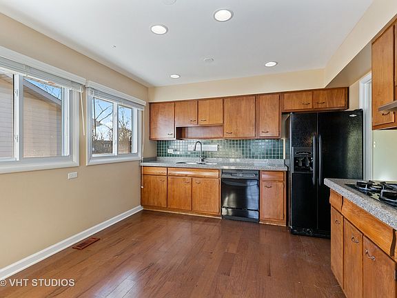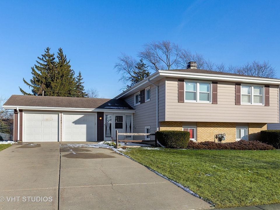 This beautiful home offers over 2000 sq feet of living space, tons of storage and an oversized 2 and a half car garage with extra storage. Beautiful HARDWOOD FLOORS throughout main living level even under the bedroom carpet and Master suite has walk in shower. Updated baths, nice size eat in kitchen with solid dark birch cabinets and black appliances, double entertaining space upstairs and in lower level that opens to large aggregate stone patio and huge fenced yard. The walkout basement has a large rec room with terrezo like tile under carpet, a bedroom with huge walk in closet, half bath that has a 5 X 3 space that would be perfect for walk in shower or freestanding tub. All the majors systems have been replaced over the last 10 years including, siding, windows, HVAC and water heater. All this plus close to all major highways, shopping and in an award winning school district.