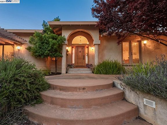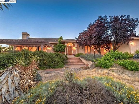 Breathtaking panoramic views and sunsets. Large open floor plan. Beautiful vaulted ceilings with exposed beams. Gorgeous light and bright kitchen with hillside views. Large master bedroom with luxurious master bathroom hosting marble floors and countertops, European jetted tub and huge walk in closet. This lovely home is on 5 acres and has gorgeous mature trees surrounding the property. Air conditioned 3 car garage, lots of parking. Large professionally build storage shed. Two stall dog run and so much more to love about this ridgetop property...The last of it's kind in Livermore.