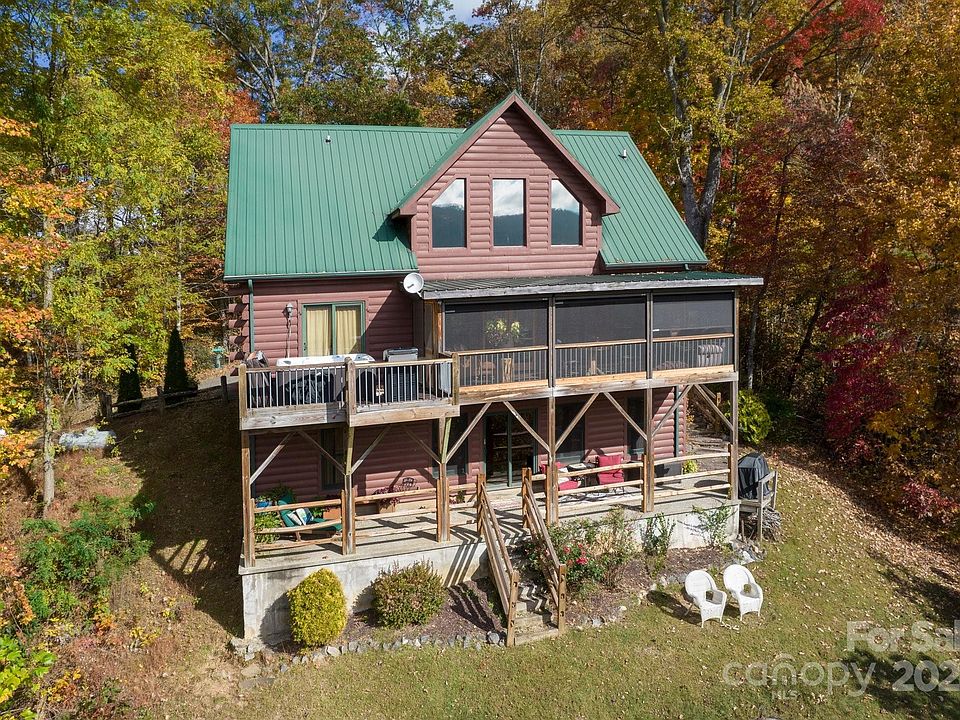 Stunning mountain views await at this custom log cabin. This 3BD/3.5BA retreat boasts luxury features, including floor to ceiling rock fireplace, high end appliances and a custom carport. The main floor has a screened in deck with shades and automatic vinyl windows to enjoy the beautiful view year round. The basement offers a private walkway to a separate entrance with large BD, full BA and second fully equipped kitchen and livingroom /game room area which can be used as a separate rental apartment. Relax in the hot tub on the deck while enjoying the mountain air. Year round views can be seen from every level of this amazing home. Bonus features include a Generac generator, metal roof, private driveway and a charming "secret playroom". Low HOA fees and plenty of privacy, full BD and full BA on each level, this home is perfect for those seeking a peaceful getaway or investment property (over $50k in rentals this year). Home sold furnished with some exclusions. A list will be provided.
