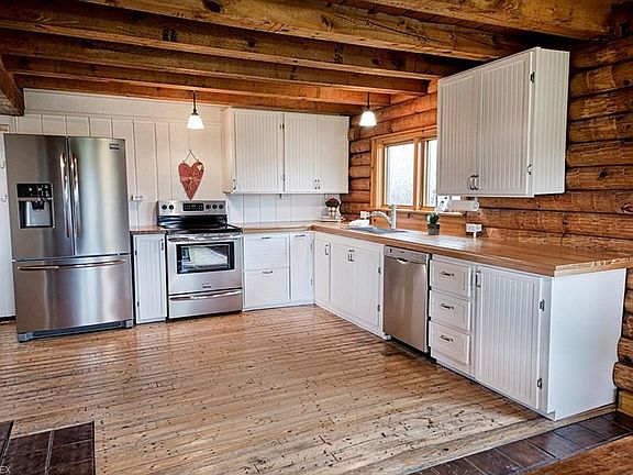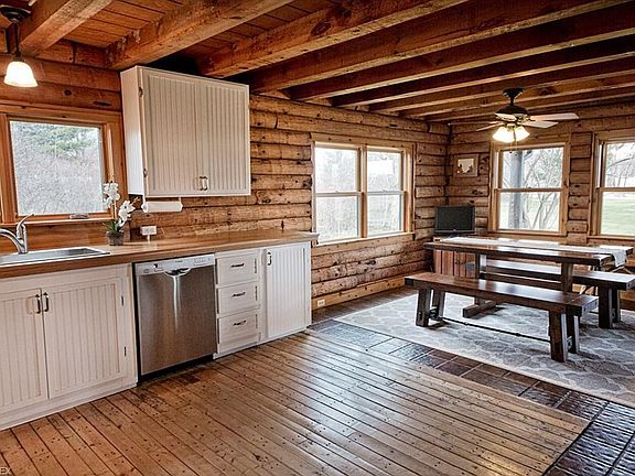 Welcome to the sweetest log cabin that sits on 2.5 picturesque acres. A beautiful and meticulously renovated three bedroom and two and a half bath sanctuary! When you enter you immediately see the craftsmanship and love that went into building this home with character of the log walls and ceilings, to the mix of hardwood and brick ceramic tile flooring. The modern kitchen includes the hand cut butcher block counters and stainless steel appliances with a rustic feel. Family room features a wood burning stove that is perfect for keeping cozy. There is an open staircase that leads to a second level common area which showcases the rich log cabin ambiance. The master bedroom and two guest bedrooms exhibits the character you would hope to enjoy and are accommodating in so many ways. The recent second floor addition allowed more closet square footage and larger bath areas. All of the baths have been remodeled to the high end standards you would expect. From the craftsman style cabinetry, dual sinks and granite in the master bath and the chic glass block shower wall design in the guest bath. Oversized two and a half car garage accommodates your hobbies. Newer roof and windows, AC 2013, and of course newer appliances with the kitchen remodel! New septic system on the schedule when weather permits with Northcoast Septic Systems! Please call for an appointment to view this lovely property today!
