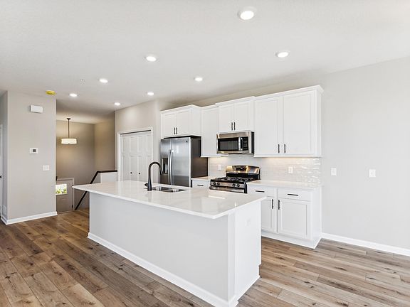 UNDER CONSTRUCTION - ESTIMATED SEPTEMBER COMPLETION. Discover the convenience and charm of this inviting Prescott townhome in Rogers, MN. Enter through the 2-car garage into the spacious lower-level entryway, where you’ll find a recreation room—perfect for game nights! Step into the open-concept main floor and be captivated by the generous living space. The stunning kitchen features a large center island, a shelved pantry, and sleek stainless steel appliances. Adjacent to the kitchen, a balcony beckons you to relax and enjoy the outdoors. The main level also boasts a private flex room. Venture upstairs to discover all 3 bedrooms and a convenient laundry room. Your private owner's suite showcases a decorative tray-vault ceiling, a private owner's bathroom, and a spacious walk-in closet. Enjoy the advantages of low-maintenance living at 13650 Marsh View Trail.