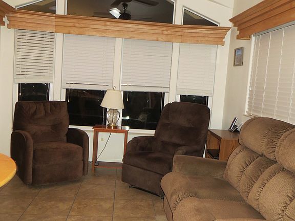 Fully furnished, Cavco 2011 park model with 14'x14' Az Room built to Yuma County codes with 2x6 walls, extra insulation in ceiling, walls and floor, attached covered deck ,Tile floor everywhere, dual pane windows, Step in shower, queen lift bed, extra cabinets, central Heat/A/C ducted to AZ Room. lg linen closet, entrance closet, ceiling fan in 3 rooms. Suitable for year round living. Murphy bed for guests. Backs onto wash for privacy, view of mountains, in Active 55+ RV Park with pickleball, ball diamond, horseshoes, shuffleboard, pools, golf, quilt/sewing room, woodworking shop and more.