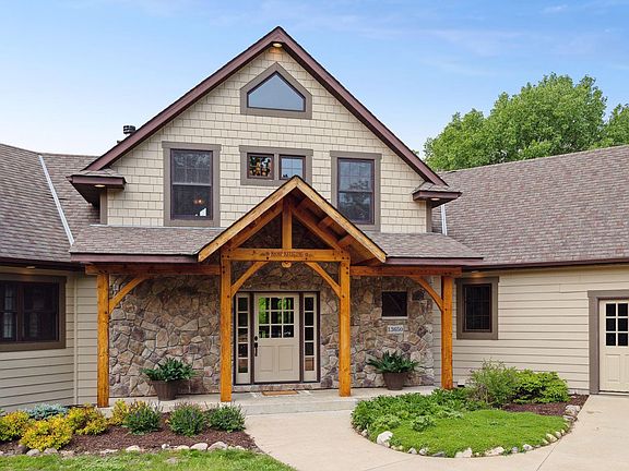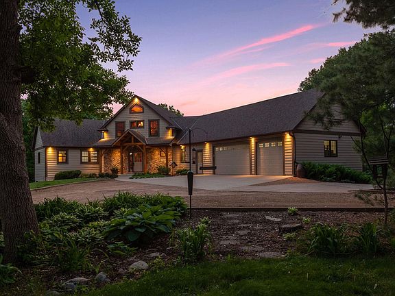 Handcrafted, timber framed home was built by true artisans. This 5200sf house has generously sized living spaces w/ beautiful finishes and flex spaces comprised of a loft and main flr den. These are complemented by outdoor amenities including a screened porch, composite deck, stamped concrete patio and spa gazebo w/ hot tub. The property offers true one-level living w/ main flr primary suite and laundry. W/O LL has heated flrs w/ a massive family rm, 2nd kitchen, 4 bdrms and 2 add'l baths - used by sellers as Airbnb w/ proven rental history or perfect MIL suite. 900sf+ LL Spancrete garage/workshop has heated floors w/paved drive. Great proximity to Stonebrooke and Water's Edge Golf Clubs on 5-acre lot w/ mature trees for privacy. Circular drive for guests and add'l parking pad. This well-maintained home contains many thoughtful features and details. It is convenient to Hwy 169 for commuting and only 30 minutes from downtown or MSP.