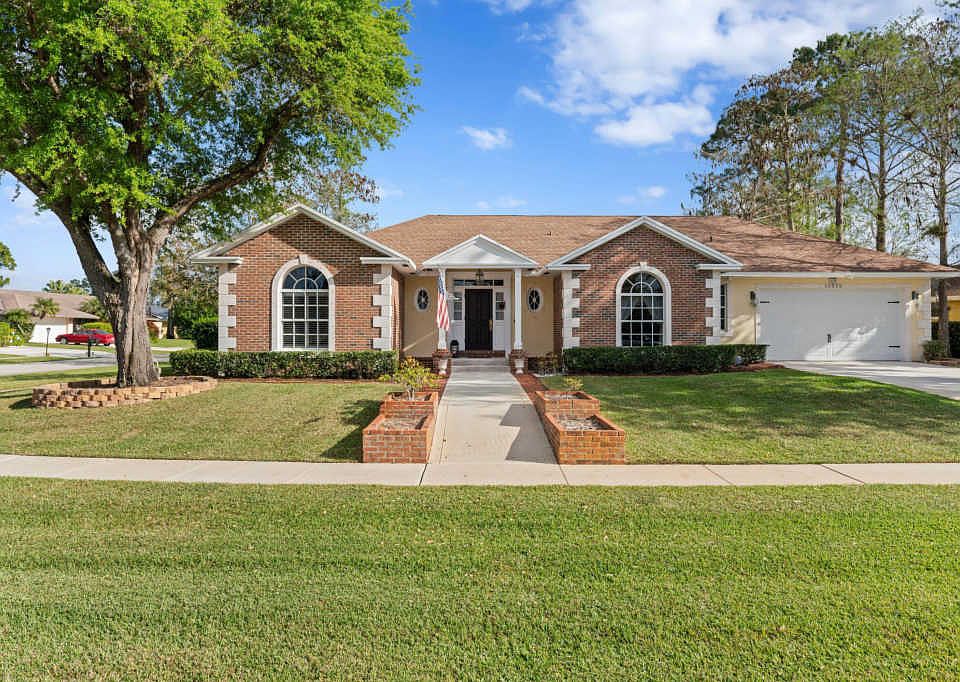 Experience southern charm in the heart of Wellington with this 3 BR 2 BA pool home in the sought after community of Sugar Pond Manor with no homeowner association! The unique St Louis brick front with step up front porch is equally appealing as walking in the front door and just feeling right at home. You are welcomed by a large great room with 9 ft ceilings and floor to ceiling built-in. An additional sun room with beautiful detailing including pickled cypress leads your eyes through the french doors out to the beautiful pool patio with a cascading waterfall. The detailing in this home is exceptional including crown molding, chair rail, wainscoting and more. This single story home offers a split bedroom floor plan with the 3rd bedroom currently used as an office with built-ins...