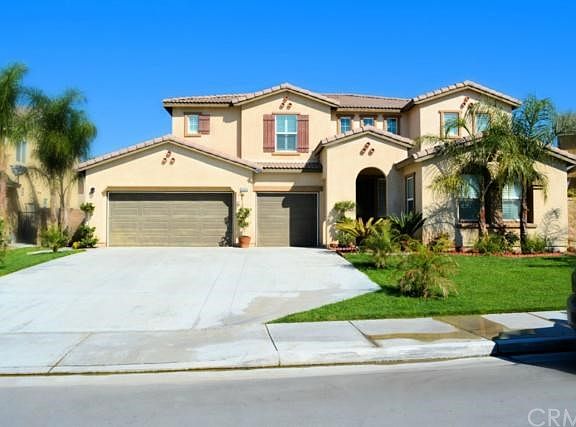 Beautiful two story Eastvale home with 5 bedrooms, 4 bathrooms and 3-car garage in a quiet cul-de-sac. Amazing grand entry way with gorgeous stairway, high ceilings, living room entry, family room with fireplace and entertainment niche and bonus loft that has custom curtains for privacy if desired. There is a spacious family room with open kitchen with granite counter tops, island, lots of cabinet space, in-kitchen dining area and formal dining room. Jack-n-Jill bathroom and great cabinetry throughout. Master bedroom with walk in closet and master bathroom with his and her sinks and separate soaking tub. New wood laminate flooring, upgraded tile throughout, custom plantation shutters everywhere, crown molding and large baseboards, new upgraded fixtures, and beautiful new paint. Large rear yard ready to be utilized to your liking with complete stamped concrete slab patio, planter bed with full landscaping. This is a great home! Close to shopping, entertainment, and great schools! Turnkey and a must see!!