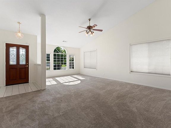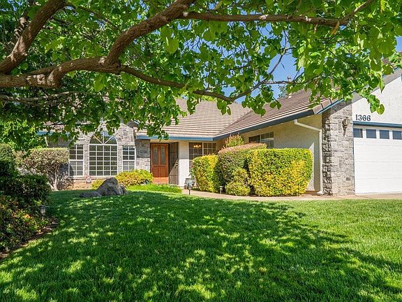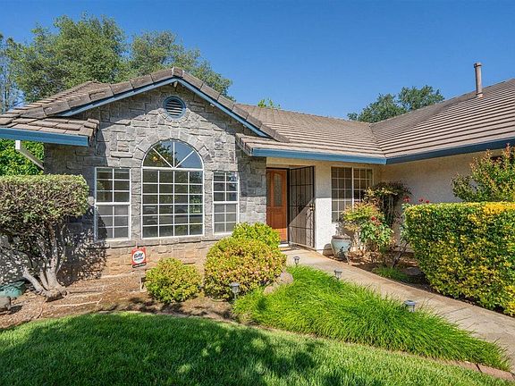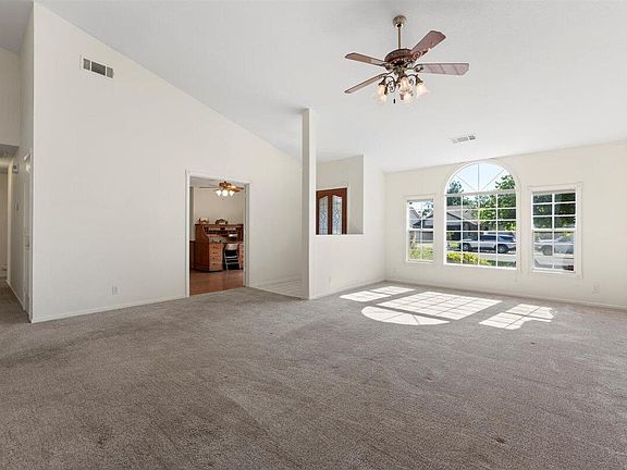 Welcome to this well-maintained and inviting residence, perfectly situated in the Oak Mesa subdivision. Offering 1,902 square feet of comfortable living space, this charming home features three bedrooms, two bathrooms, and a versatile office that could serve as a fourth bedroom. The interior boasts spacious vaulted ceilings that add a sense of openness and grandeur throughout, complemented by a cozy fireplace in the living area, making it perfect for relaxing evenings. The kitchen boasts a garden window, island, tile countertops, and plenty of cabinet space—ideal for cooking and entertaining. A sliding glass door leads you to a covered patio, perfect for seamless indoor-outdoor living. The primary suite is a true retreat, featuring a large bedroom with private access to the patio, a walk-in closet, and an en-suite bathroom with a double sink vanity, relaxing soaker tub, and a separate shower stall. Outside, the backyard is a tranquil oasis, featuring fruit trees, a charming koi pond with waterfall, and a shed for additional storage. The front and back yards are meticulously landscaped, enhancing the home's curb appeal and providing a peaceful setting. Additional highlights include a laundry room, spacious three-car garage with two bays and plenty of attic storage space above, offering ample room for vehicles and storage needs. Located close to walking trails and convenient shopping, this home blends peaceful living with everyday convenience. Don't miss the opportunity to make this lovely property your new home.
