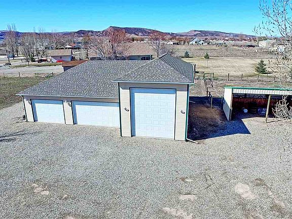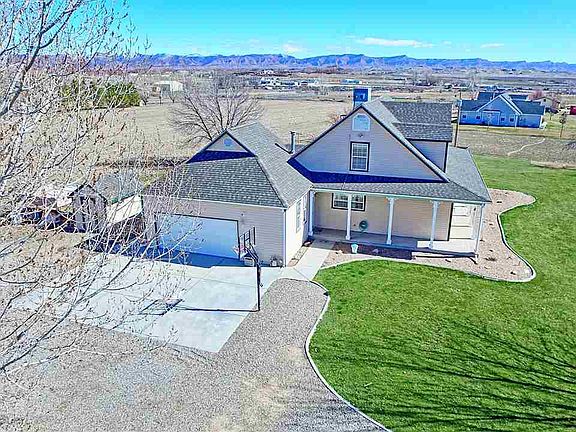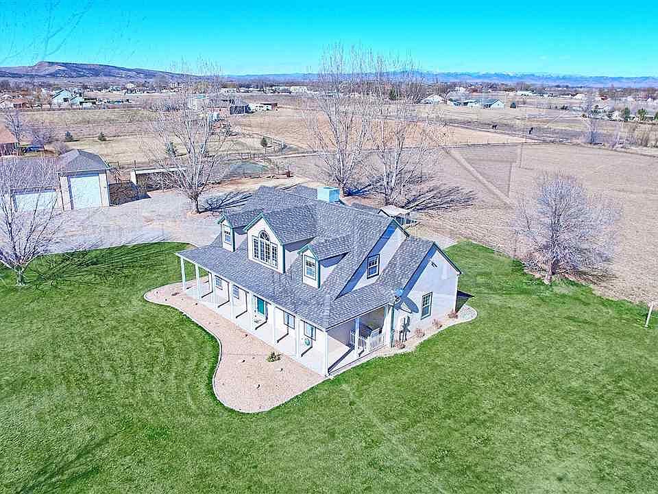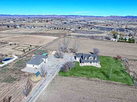 Beautiful setting on 5 irrigated Acres ! Incredible views! 2 Car attached Plus 4+ detached Garage/Shop with RV Bay! Relaxing wrap around deck & patios to take it all in. Main level master suite has a jetted tub, 2 closets, slate tile floors & shower, granite countertops, & glass sinks. The man level also offers a comfortable living room with gas fireplace, formal dining room, kitchen with stainless appliances, island, breakfast bar & eat in area. There is also a large mud/laundry room with utility sink & pantry area. Upstairs, you will find 3 more bedrooms & full bathroom. Just some of the other features include hardwood floors, central air, new roof, 7 X 14 Chicken Coop, 8 X 12 Shed, pole barn, gated pipe, irrigation system w/ 5 zones & more!