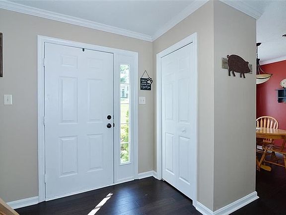 Check this out- so far from the road. Beautiful wide planked hand scrapped Bamboo hardwood flooring accented by crisp white baseboards. Exceptional woodwork throughout the home with all doors and windows are framed with moldings. The kitchen has ample wood cabinetry and clean white counter top. Under cabinet lighting, back splash and oil rubbed bronze handles. Lovely eating area overlooking the front lawn. The home has an open floor plan with the dining room and great room all one large space. The fireplace is the center of attention with its gorgeous woodwork. All bathrooms have ceramic tile flooring. The second floor has three bedrooms and the owner's suite has a private bath and large walk-in closet. Great deck off the great room. The home has new light fixtures throughout as well as door handles. A new awning is on order(similar to the neighbors) New carpeting is on order for the staircase and the whole second floor. Pristine condition with neutral current colors.