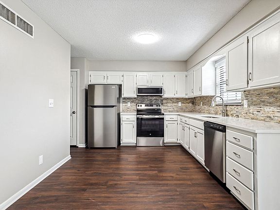 Custom remodeled 3 bedroom 2.5 bath townhouse located near I-35 119th corridor in Olathe. Direct access garage with full walk-out basement includes washer dryer hookups. Brand new quartz counters in kitchen and bathrooms, stainless steel appliances, upgraded cabinets, luxury vinyl wood plank flooring, lighting fixtures, carpet and paint. The dining room has sliding doors that lead to a deck overlooking a large back yard that includes lawn care. Vaulted ceiling in living room. All three bedrooms are on the second floor. Master bedroom includes a walk-in closet and full vanity in the bathroom. Keyless secured entry.