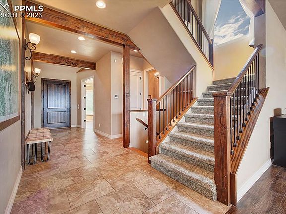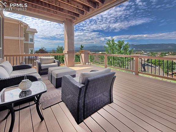 Enjoy captivating views from virtually every room in this fully custom, high-end home. With grand upgrades throughout, this property is perfect for entertaining and boasts large structural wood beams * 6 bedrooms, plus office, plus craft/storage room * 4 bathrooms * ceramic wood looking floors, tile and hardwood floors on main level * granite countertops throughout * 3 composite covered decks * oversized 4-car garage with built-in shelving * 10 ft. ceilings in basement * huge walk-in kitchen pantry * desk space off kitchen * tons of storage and closets everywhere * great home for multi-family use. Step through the oversized gorgeous wood door to an expansive entrance with massive windows framing unobstructed views of Pikes Peak, the entire front range mountains and the Air Force Academy. A spacious office on the main level has multi-functional uses, including a billiards room. The open concept in kitchen, living room and dining room is ideal for hosting guests. The covered deck off the dining creates even more usable indoor/outdoor living. Upstairs boasts a large loft or additional family room, master suite, 5 piece bath, with laundry off the master closet, 3 additional bedrooms, huge bathroom and a craft room complete the space. Walkout basement with 10 ft. ceilings comprises the living quarters of a game room, family room, oversized wet bar or mini-kitchen, 2 additional bedrooms and bathroom creates a peaceful retreat. This exceptional home has fabulous and easy access to I-25, shopping, entertainment and restaurants within walking distance.