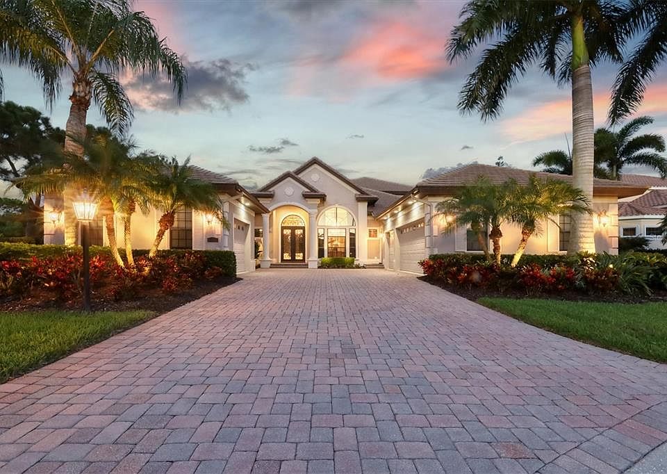 Live in the heart of Lakewood Ranch in this stunning Lakewood Ranch Country Club home. Perfectly positioned on a cul-de-sac for privacy and to deliver long lake and golf course views, this 4-bed, 4.5-bath home embodies the essence of luxurious Florida living. The custom glass and wrought-iron double doors give way to the main living room with 10-foot sliding doors that welcome natural light to brighten up the entire space. The adjacent formal dining room features a large window and a mirrored wall with crown molding. The kitchen boasts granite countertops with ample space for seating, dual pantries for added storage, and the perfect layout for those who love to cook and entertain. The breakfast nook faces the kitchen, with a large aquarium window to add natural light to the kitchen and adjacent living room. There is also a bar area perfectly positioned between the kitchen and living room which is ideal for entertaining. The family room features a wall of built-in cabinets and additional 10-foot sliding glass doors, which open to the large lanai and pool area. The first floor holds the owner's suite, which is complete with built-in cabinetry, a sitting area with room for a desk, dual walk-in closets, and a luxurious bath with dual vanities, a Roman shower, a large jacuzzi tub, and a private water closet. The main level also has two private guest rooms, each complete with an en-suite bath. The second floor boasts a large bonus area perfect for entertaining as it has a wet bar with a dishwasher and a grand wine cellar. For those who enjoy the fresh air, the upstairs lanai provides ample seating and stunning golf course views. Just off the bonus room, you will find an additional guest room with another en-suite bath. Outdoors, you can enjoy the saltwater pool and spa or enjoy a fire and delicious meal in the outdoor kitchen. Additional amenities in this home include a large laundry room, four-car garage with built-in storage, paver driveway, polished travertine floors on the first floor, dark hardwood on the second, and much more. When exploring this award-winning community, you will find two amazing clubhouses, a fitness center, tennis and pickleball courts, in addition to pristine golf courses. Lakewood Ranch Country Club is conveniently located near Lakewood Ranch Main Street, the new Waterside Place, and shopping or dining at UTC, easy access to I-75, and a short drive to the beautiful beaches. You won't want to miss this opportunity!