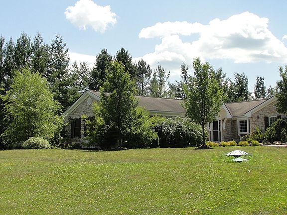 This sprawling stone faced ranch has open and airy atmosphere. From front to back, top to bottom extras abound thru-out this home. European tile inserts in foyer, dramatic coiffured ceilings and fireplace in Great room, to the stunning Brazilian floors and vaulted ceilings. You will notice right away the beautiful Designer indoor/outdoor lighting. Master suite has a jacuzzi tub, granite counter and walk-in closet. Kitchen offers double oven, 36" gas range, skylights and french doors. Dining room is Brazilian cherry hardwood floor and quite spacious. Basement is finished offering Media Room with adjoining wet bar, Play/Bonus room, Office and more. Plus!!! Carriage House style detached 4 car+ garage/workshop w/9ft doors, heat, water, electric and finished apartment/in-law suite on second floor. All on 3+ acres. Septic replaced 2010. Neighborhood Description Cul de sac. Quiet and peaceful.