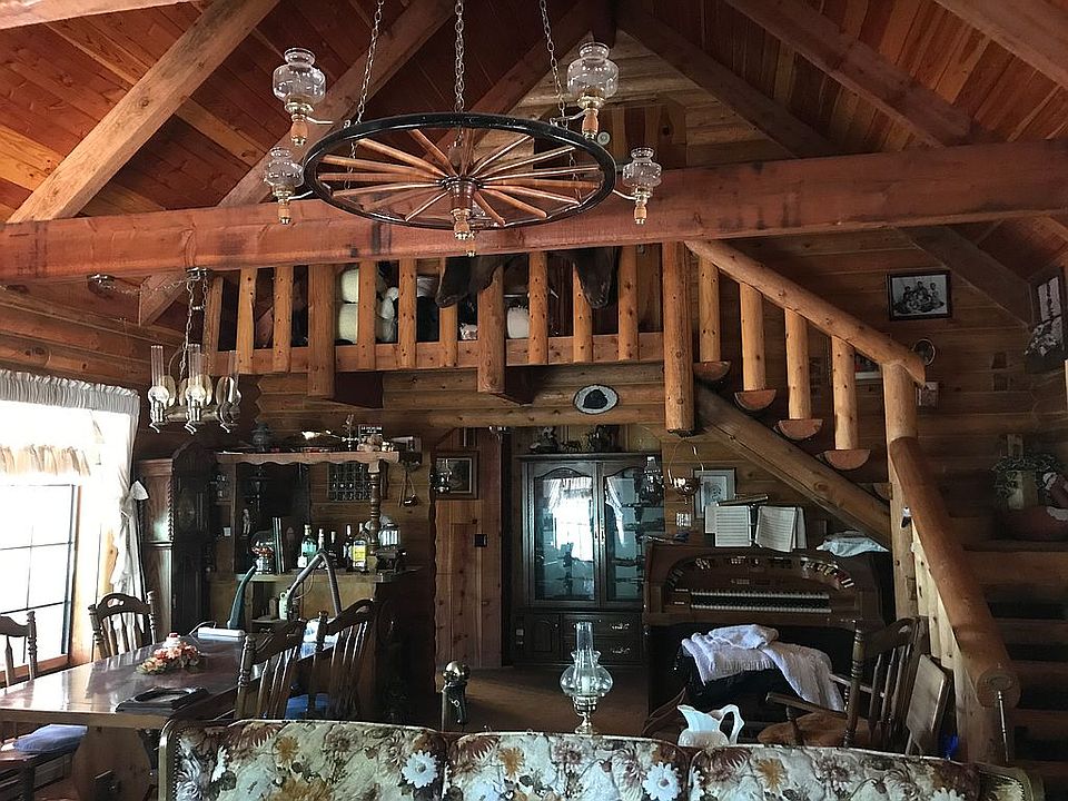 This beautiful cabin that backs the national forest. It has the utility room in the basement. There is two covered porches and a deck off of the main bedroom. There is a full bathroom and bedroom on main floor and two bedroom up stairs with a connecting bathroom. This house is truly made from logs that has a staircase that shows the beauty. The lot has a huge 3 car garage with a half bathroom.