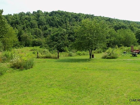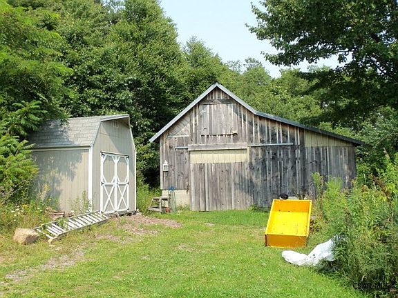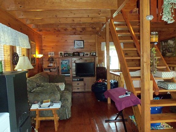 Quaint Home/Magnificent Cabin! This unique structure was constructed in 2007 and consists of a kitchen, full bath, open area for living room and bedroom and second floor balcony with storage. There is potential for additional bedrooms on the second floor. The property is serviced with spring water and the home is heated with a pellet stove and a propane wall unit. There is 24' X 26' horse barn that is about 16 years old, a shed, and a former chicken coop. Private location with a pond and Bixby Run crosses the property.