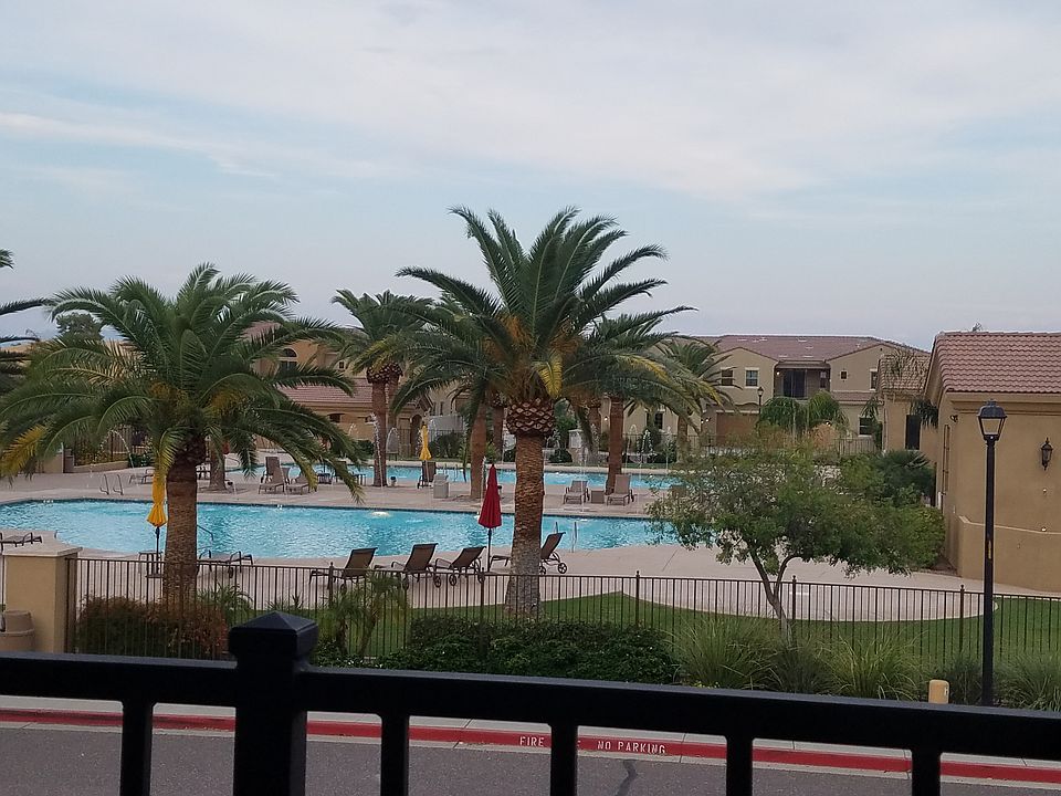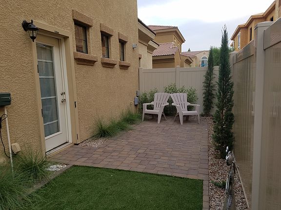 Model home with tall ceilings, upgraded floor tile downstairs. Kitchen backsplash, upgraded dark wood cabinets in kitchen and bathrooms and granite countertop in kitchen. House is wired for surround sound, and set up with central vac and a security system. The stairs lead up to a loft on the 2nd floor (which is a great office space) from which you can access the balcony that overlooks the community pool. There are 3 bedroom and a laundry closet with a full sized washer and dryer. There is a linen closet across from the laundry closet as well as one in the Master Bath. The Master Bedroom has a walk in closet. Off of the kitchen there is a French door that leads to the recently finished backyard with pavers, artificial grass and a garden. The irrigation system makes it easy to take care of!