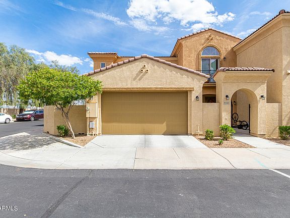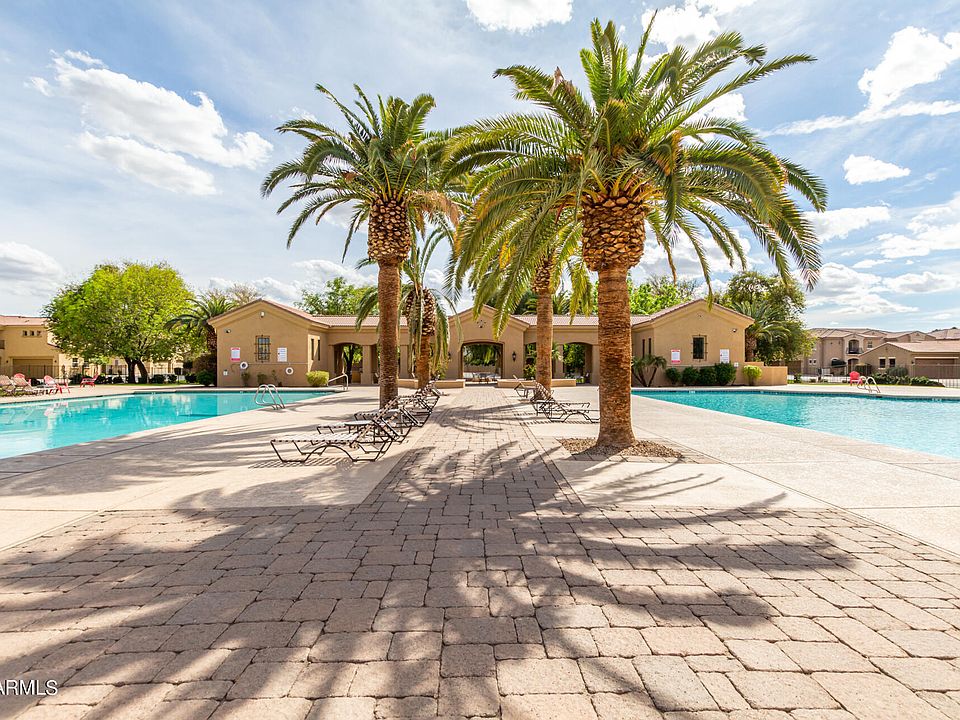 Start living in this lovely two-story townhome now available! This end-unit abode offers a 2-car garage and a private courtyard, excellent for welcoming guests. Discover an open layout filled with natural light, a neutral palette, high ceilings, tile flooring, and sliding glass doors that merge indoor and outdoor living. The gourmet kitchen includes stainless steel appliances, rich wood shaker cabinetry, recessed lighting, and granite counters. Venture upstairs to find a bright loft ideal for a reading nook. The carpeted main bedroom is a sanctuary that boasts a dedicated bathroom and a walk-in closet for added convenience. This prime community offers gated access and resort style amenities including a workout facility, two Olympic-sized pools, two hot tubs, splash pad, BBQs and Ramadas.