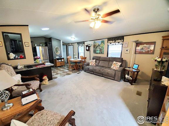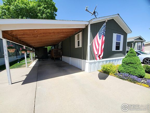 Beautiful and very well cared for home in Loveland's premier 55+ park, Sylmar! Quiet location yet close to everything and smaller dogs/ indoor pets ok. Plenty of parking with the oversized carport. Covered front steps connect to the carport and even creates a nice patio area. Once inside you find a great open layout with new carpet in the living room which flows right into the kitchen and dining area. Classic, deep colored cabinets complete with counter top overhang, if additional seating is desired. Stainless sink, fridge and gas range, plus all appliances are included, even the clothes washer and dryer! Primary bedroom has new new carpet and walk in closet. Primary bath has a large vanity with plenty of counter space, huge walk-in shower with shelves and glass doors, and linen storage cabinet. 2 Additional bedrooms and a full bath at opposite end of the home. Nice shady and grassy yard with gorgeous established landscaping out front. Storage shed for all the yard tools and even has full electric. Small, privately owned park with lower lot rent at only 890/ mo! You won't want to miss this one! Financing is available, call agent for more info or to schedule a showing today!