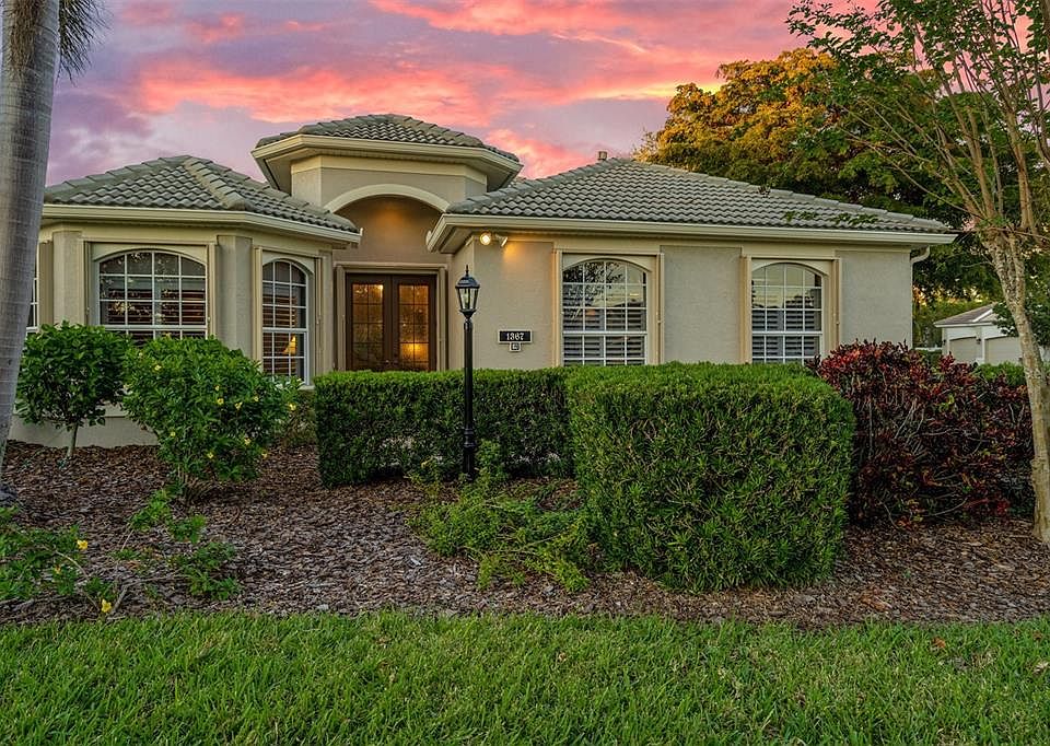 High-end finishes with a grand entry hall and tray ceiling with rich crown molding welcome you to this enchanting Lee Wetherington-built residence, located in Willowbend. Perfected by discerning sellers with unending attention to details. Ideally positioned home on a ¼+ acre homesite with the largest front yard a roomy side-entry paver driveway and an oversized garage with many cabinets. Private lanai and backyard setting for quiet outdoor living. Mature landscaping provides additional privacy and shade in the front and back of the home. Wrap yourself in luxury in a stunning retreat home with all 20” porcelain tile flooring, marble inlays, wide crown molding, elegant arches, plantation shutters, and the popular Willow floor plan. An inviting gathering room and dining room lead to an amazing kitchen that is the heartbeat of this incredible home. Gourmet kitchen, with natural gas cooking, stainless appliances, granite counters, and painted cabinets in a trending decorator color. Adjacent is a separate breakfast nook with tranquil views. The family room has a tray ceiling and triple sliders to the outdoor haven. A spacious owner’s suite is completely outfitted: Walk-in closets, dual sinks topped in granite, a walk-in shower, a deep garden tub, and a door leading to the screened lanai. Two additional bedrooms have nice separation with their own shared bath. Additionally, a lovely den/office is spacious with bay windows. The outdoor living is just as compelling. Through pocketing sliders find serenity with a large, covered lanai with pavers to enjoy morning coffee or an evening beverage. Hurricane protection on all doors and windows installed in 2021 for peace of mind. On a practical note, AC replaced in 9/2022, water heater in 2018. The entire exterior was newly painted on 12/2022. Low HOA fees cover yard maintenance, irrigation water, high-speed internet, and basic cable, heated community pool and spa, fitness center, basketball, pickleball court and playground. Ideally located close to beautiful Gulf beaches, Oscar Scherer State Park, Legacy Bicycle Trail, Pine View School, and numerous waterfront restaurants and Tiki bars, with a Publix and Kahwa Coffee shop within a short distance. It's easy to perfect the art of living when you live within a work of art with extraordinary curb appeal and lush landscaping.