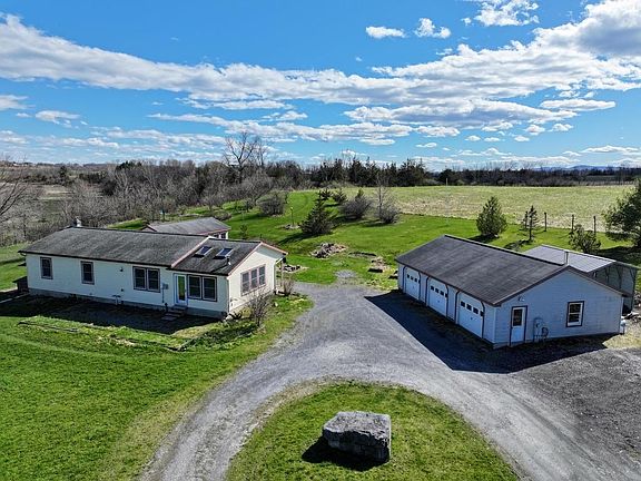 This one level home sits on 10 acres and enjoys easterly views of Snake Mountain. The property also includes an additional 384 SF structure- heated by a wood stove, that is perfect for a studio, writers cabin or music space! The two bedroom home has an open layout, giving it a roomy feel. The spacious living room has a cathedral ceiling with skylights for added light and is warmed by the pellet stove on those cool evenings. That living space is open to the large kitchen/dining area- with loads of natural sunlight. The kitchen island adds additional storage and casual seating. Down the hall is a renovated full bath and two bedrooms. The primary bedroom has two closets and a sitting area at one end. The basement has ample storage space, and the washer and dryer are there along with the other utilities. A three car garage has one bay that is insulated and heated- great for a workshop or conditioned storage. Solar panels on the roof help out with your electricity costs as well! There is enough land to have substantial gardens or animals, whatever you desire! Just 20 minutes to Middlebury, and 15 minutes to Vergennes- this convenient location is also close to Lake Champlain! We have received multiple offers- Sellers would like all offers submitted by 4 PM on Friday, 4/26.