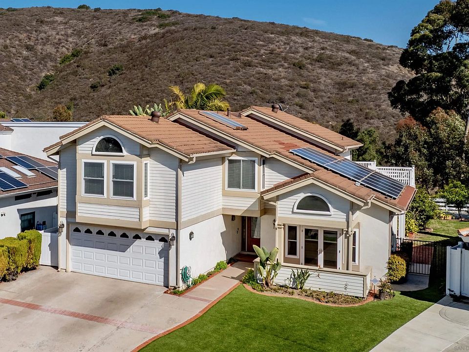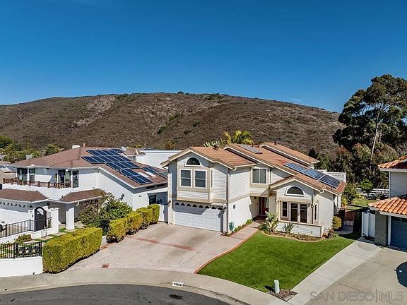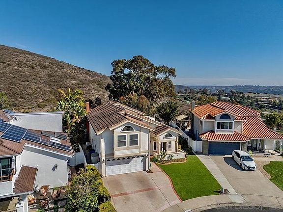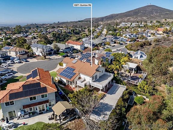 Welcome to 13671 Quinton Road, the largest floorplan within PQ's beautiful Kentfield Estates! With over 2,800 square feet of living space, this five bedroom plus bonus room, three full bathroom floorplan has room for the whole family and then some! In addition to the spacious living areas, this house also features a convenient bedroom with full bathroom on the first floor. Upstairs there are four additional bedrooms, including a huge primary suite (22x18) and a large bonus room (18x17) over the garage. Lovingly maintained by the same owner for the last 39 years, this is truly a special property that just feels like home. You’ll love the quiet cul-de-sac location as well as the large, pie-shaped lot that measures 10,034 square feet in size. Two decks at the rear of the house were added to take advantage of the wonderful views and to provide extra room for entertaining. There is an impressive 930 sq ft back yard deck as well as a 549 sq ft balcony off the primary suite that also provides a large, covered patio below. Notable upgrades to the property include: Owned solar with 16 panels (3.4 KW) added in 2013; a tastefully remodeled kitchen with rich wood cabinetry, stainless steel appliances, granite counter tops, and upgraded exhaust fan in 2016; dual pane vinyl windows & doors in 2008, and more. This home feels light and bright, with vaulted ceilings in the living & dining rooms and three sets of French doors that lead outside. Located within the esteemed Poway Unified School District (PUSD) with no HOA or Mello Roos.
