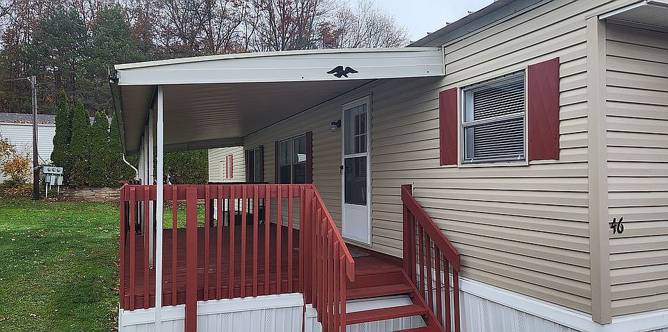Two bedrooms 1full bathroom move in ready all New carpeting throughout New vinyl flooring fresh paint appliances included refrigerator, oven open concept skyline mobile home manufacturer New vinyl siding covered deck located in uniontown OH Mace mobile estates lot rent per month $390 includes water sewage, trash pickup Two car cement driveway located on property within 3 feet of home background check upon sale of home No land contract or rental sale of home only small pets are allowed