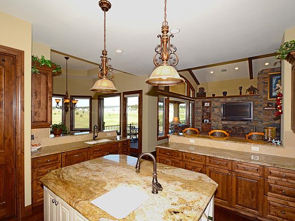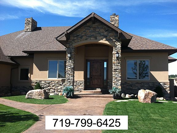 Enjoy a private pond, an orchard with over 40 Fruit Trees, an outdoor Riding Arena right outside a beautiful monitor barn. The fantastic horse property is fenced along with a gated inner fence around the house. Dogs have a 12+ acre invisible dog fence playground. Incredible newer home (2012) on 36.87 acre ranch property with a Pikes Peak view, a private pond, large barn, and 360 degree views above the rolling hills. Colorado main floor living at its best. Hardwood floors, granite throughout, Stone fireplace. Master has separate XL his and hers walk in closets. Huge walk-in pantry. Gourmet kitchen. Open floor plan. Large covered deck. 40 x 60 Monitor Barn with huge loft...plus heated office/guest qtrs with full bathroom. Five car over-sized garages and workshop. Great upgrades.