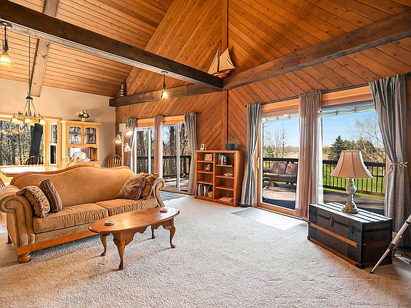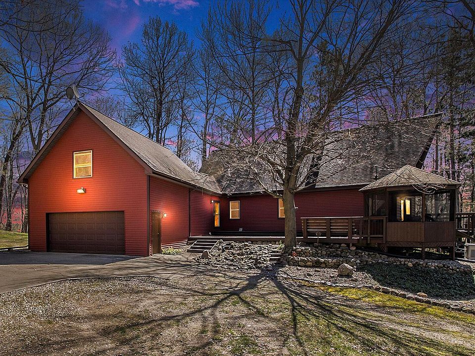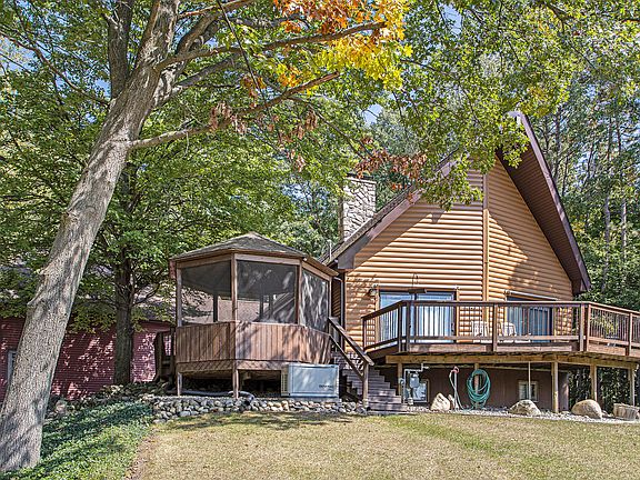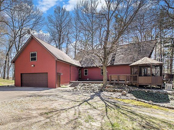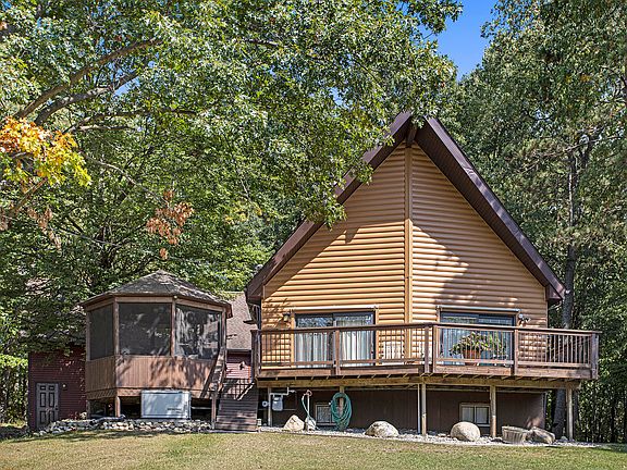 This enchanting A-frame chalet has 3 bedrooms, 2 baths, & sits majestically on 11.45 acres of woods & open field. Inside discover vaulted ceilings, exposed beams, & large windows. The open-concept connects the living room, dining area & kitchen which is equipped with modern appliances, ample cabinet space & breakfast bar. Outside, the expansive deck beckons you to entertain guests, or simply unwind. Notice the walk-out basement, whole home generator & 24 x 24 outbuilding. 60 min from Grand Rapids or Lansing & minutes to Battle Creek & Hastings, this property offers convenient access to urban amenities while still preserving a sense of seclusion & tranquility. Retreat to the spacious second floor suite with its own private bath and picturesque views of the surrounding landscape, providing a tranquil sanctuary to unwind after a long day.