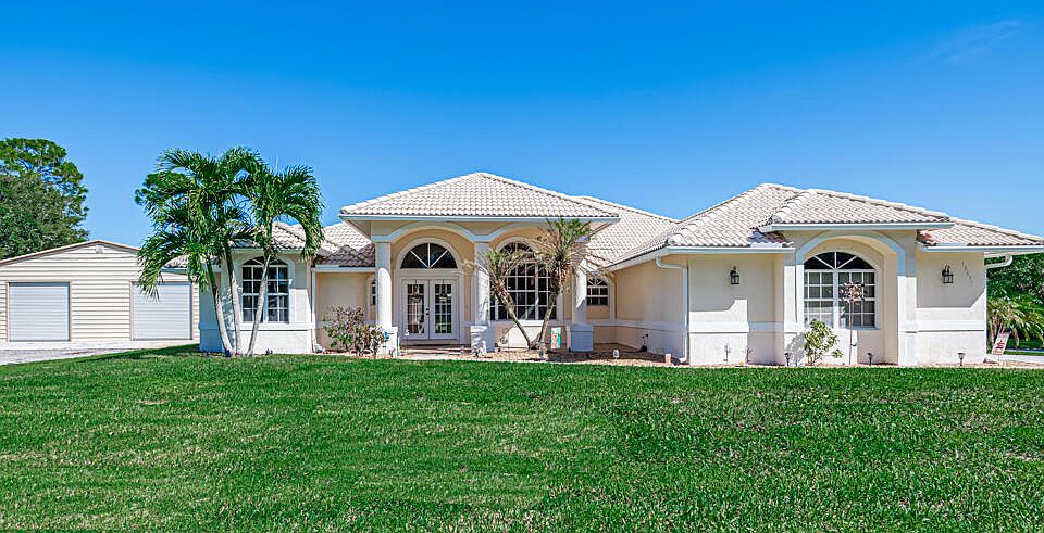 Welcome to the home that has it all! This 3 bedroom 2 bath pool home with a detached garage is move in ready! As soon as you enter the french door entryway you have a beautiful view of the pool area. Relax under the new tiki hut or the screened in covered patio by the saltwater pool with a decorative surfaced deck and a classic black iron fence surrounding. Then head out to the 40x40 detached garage with a mini split A/C, water, lift, 2 10 ft doors on the front and an 8 ft roll up door off the back that leads to an open, covered 40x26 addition on the back. Inside the home, the Kitchen was just upgraded in 2022 and the large master bath was done in 2020. The home has a full Reverse Osmosis system! Keep the lush landscaping beautiful with the a 6 zone sprinkler system. MUCH MORE, A MUST SEE!