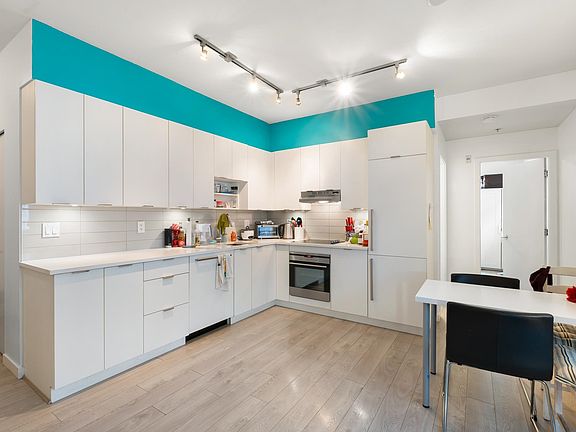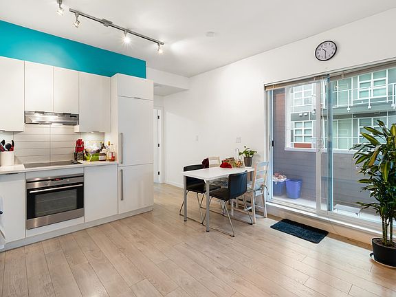 This 2nd floor 500sf 1 bed 1 bath CORNER unit w/ courtyard views. Features an exceptional floor plan: large kitchen with plenty of cupboard space, upgraded appliance package - built in Bloomberg fridge/full-size dishwasher & Electrolux range w/ convection oven. Open living space, high ceilings and a spacious bedroom large enough for queen bedroom set & covered balcony. Clean colour scheme w/ white embossed cabinetry, Quartz Countertops and light-grey Laminate flooring throughout. IN-SUITE LAUNDRY, 1 Secured UNDERGROUND parking & 1 STORAGE included! Well maintained building in Tien Sher's master planned community in booming city center! Walking distance to SKYTRAIN & future LRT line.