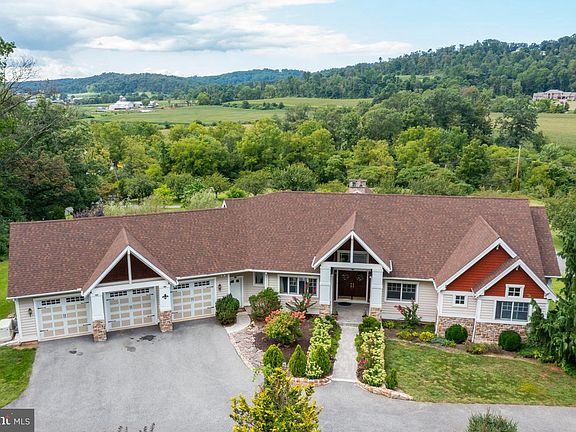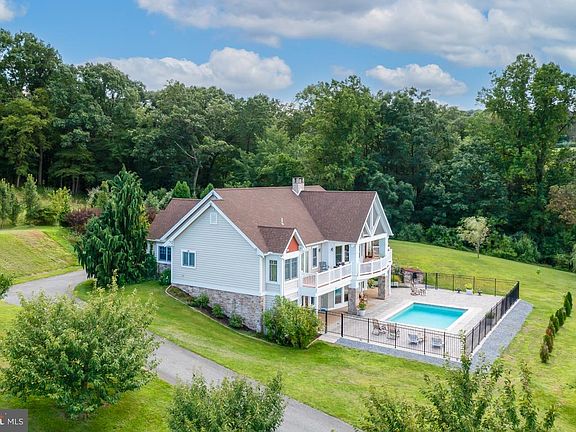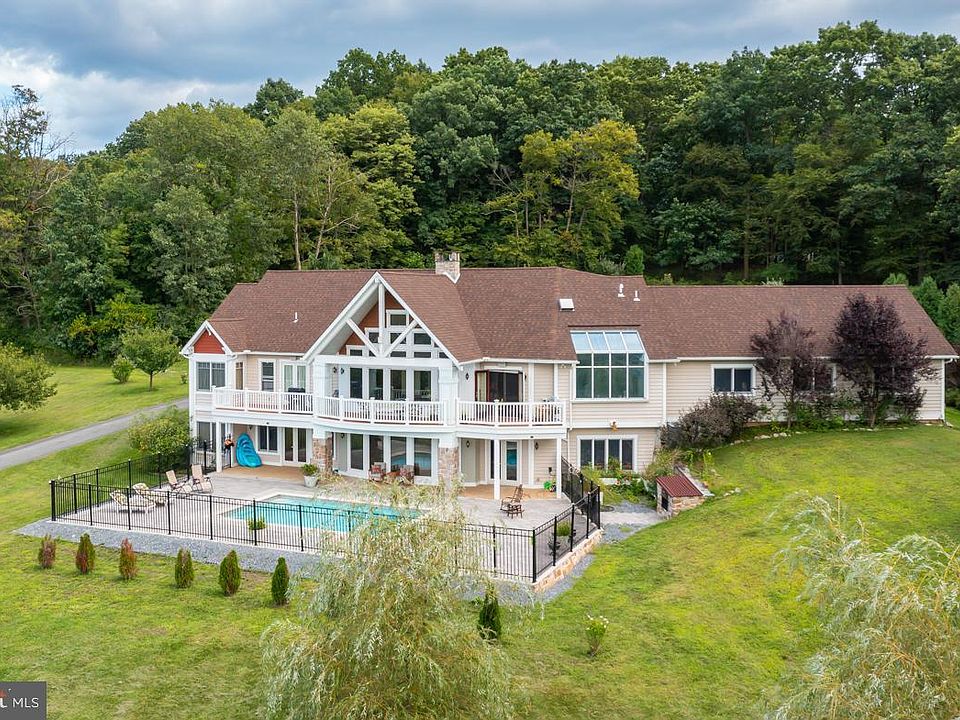 Stunning One-of-a-Kind Home with spectacular views from every angle! This custom designed Greth home is situated on 5.29 acres with 3 bedrooms, 3 1/2 baths and more than 3,600 square feet of living space. The gated and stone pillared driveway is flanked by stunning flowering cherry and catalpa trees. As you enter through the large front double doors, you will find a 2-story foyer with a floor to ceiling stone, double-sided fireplace and lovely hardwood flooring which flows nicely throughout most of the main level. The home features an open floor plan with a gourmet kitchen with a granite island with seating, granite countertops, a large wall of windows for lots of natural light, a wall oven and microwave, 6-burner Wolf range, GE refrigerator, plenty of cabinet and counter space, access to the rear deck and there is a dining room area which has a double tray ceiling. The sunken great room features a cathedral ceiling and a wall of windows to take in the view and sits right off the kitchen. There is a a convenient powder room and a main floor office, which comes with all furniture. Double doors lead into the primary bedroom suite, which has a large walk-in closet and there are also French doors that lead out to the deck. The master bath has a beautiful tile surround stall shower, heated towel rack and soaking tub, which is surrounded by windows. There is another nice sized bedroom with a vaulted ceiling, walk-in closet and its own full bath. The main floor laundry room is quite spacious and comes with a sink and newer flooring. The lower level holds a large family room with French doors to the rear patio and pool area. There is a third bedroom with its own bath and a large recreation room that can be used as an exercise room or theater area and has access to the rear patio area. Your private outdoor oasis consists of a large Trex deck, great for grilling with family and friends, as well as a brand new, freshwater inground pool with patio surround. Also included is a whole house sound system, two zone heating and cooling, 3 car garage with inside access and a dog bath with a heated water tank, a whole home generator, fencing along frontage roads, a security gate and stone pillars, a newer roof, new front walkway and stone stoop, as well as extensive landscaping and trees. Convenient location only 5 minutes from the PA Turnpike and convenient access to shopping and restaurants. Bring the horses--zoning does allow for 2-3 horses. Don't miss out on this stunning home, your own private oasis.